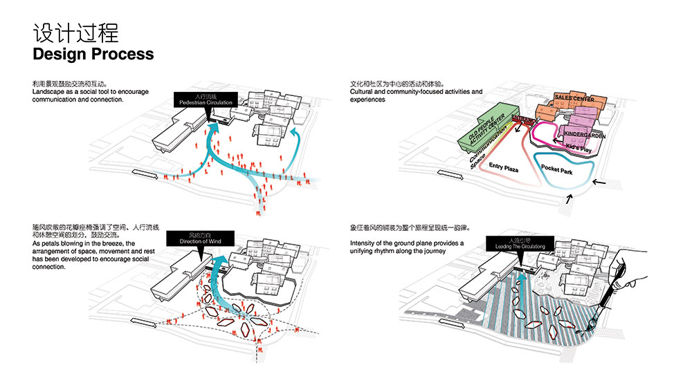 一期的景觀設計最終由口袋公園、社區(qū)花園和幼兒園三大主要空間組成,每個空間都提供了獨特的體驗,為兒童、大人、老人相聚提供了空間,讓他們享受玩耍的樂趣、感受生活方式多樣性和體驗城市的活力。