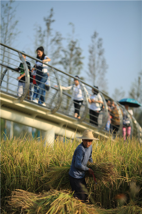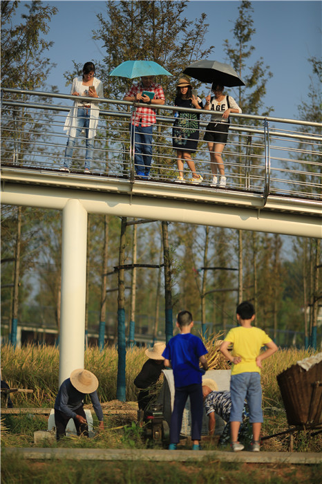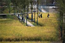 在考古遺址向一個靜靜的舞臺,默默地激發(fā)著人們豐富想象力的同時,戶外水稻博物館的田野猶如一臺活生生的,正上演著活生生的農(nóng)耕生產(chǎn)劇:水稻種植、除草和收割都被設(shè)計成與休閑活動相互交織的生動元素,融入了諸如慢跑、野餐、散步、學(xué)校和家庭的郊游。玻璃廊橋作為觀景平臺和使人身臨其境,讓城市游客能夠親眼目睹和體驗水稻種植及收割過程,并與勞作的農(nóng)民進(jìn)行親密接觸。參觀者亦可以加入到農(nóng)民勞作之中,體驗其中的艱辛與快樂。在這一景觀中,勞作與休閑、生產(chǎn)與藝術(shù)、鄉(xiāng)村與城市、土地所有者和游客、功能和審美之間都不分彼此地融合在一起,營造出美麗和諧的一幕。