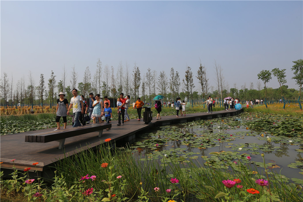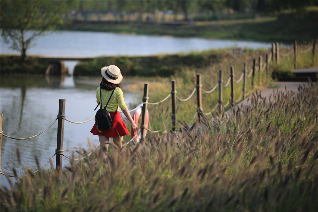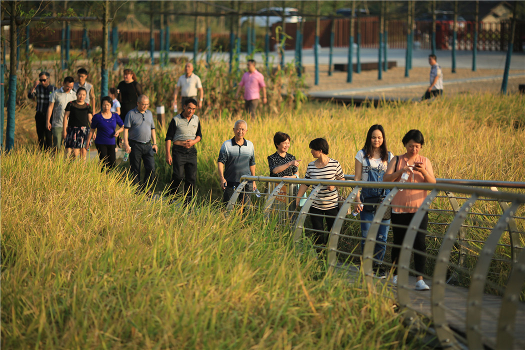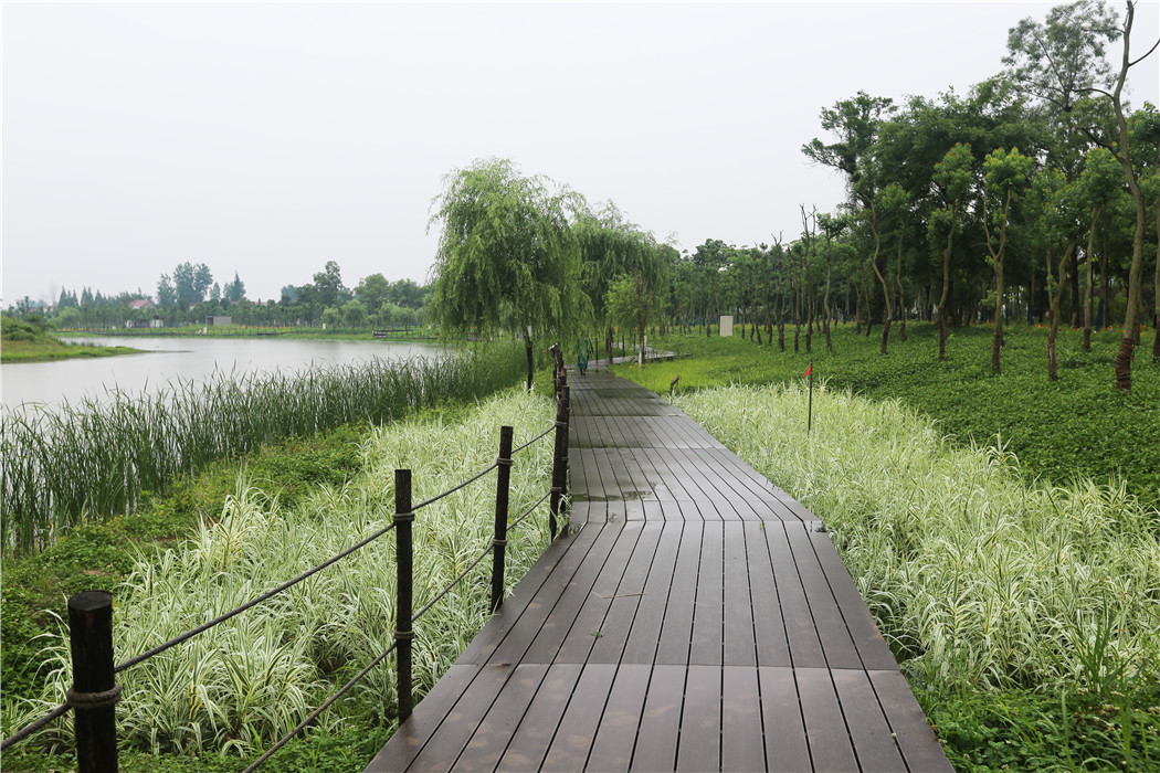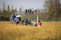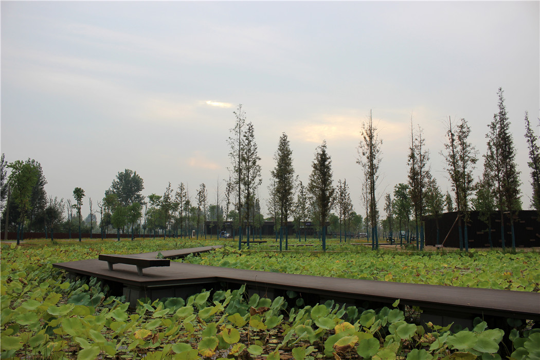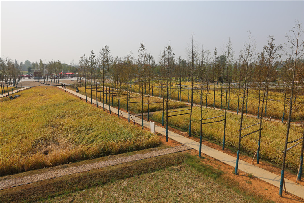 其次,用各種濕地植物及林帶,對環(huán)繞古城遺址的護(hù)城河外側(cè)水岸進(jìn)行生態(tài)修復(fù)。核心區(qū)以外的公園的主體部分,被重新設(shè)計為農(nóng)田,成為了一個戶外的稻田博物館。一年兩季、多品種的水稻在這里輪作;作為農(nóng)田景觀的有機(jī)組成部分,水塘、水渠和濕地分布其中,生長著茂盛的鄉(xiāng)土植被,這些濕地和水系像海綿一樣,收集雨水,調(diào)節(jié)旱澇,同時吸收和過濾從稻田中流失的營養(yǎng)物質(zhì)。精心設(shè)計的景觀紋理將戶外水稻博覽區(qū)與其他一般性的農(nóng)田具有相似卻有不同的景觀,這些田塊肌理致密,田埂的朝向經(jīng)過仔細(xì)的設(shè)計,形成多種微妙變換的透視角度。水杉林帶只沿著大致南北方向的田埂路種植,既能給田埂路遮蔽,同時又防止樹影投射在稻田里,因為這些稻田需要充足的日照來維持生長。夏日炎炎,綠蔭下的道路為游客提供了舒適駐留和漫步機(jī)會。