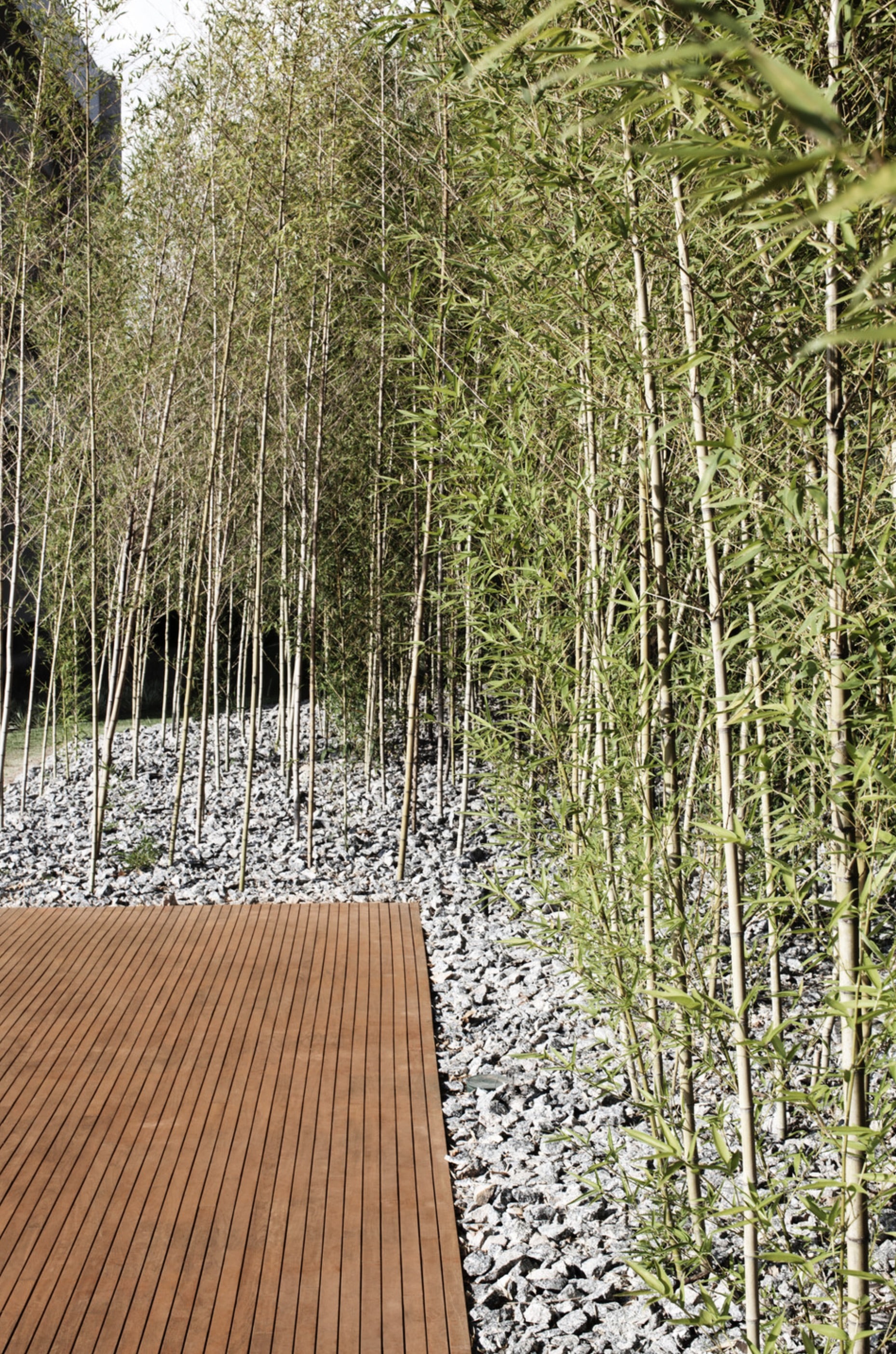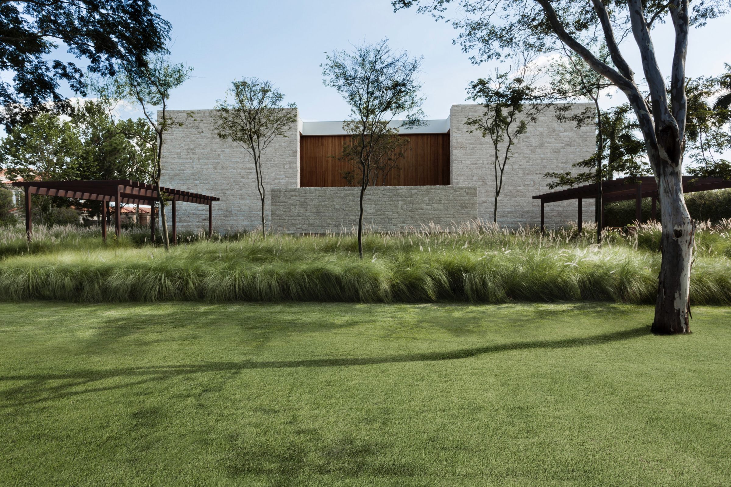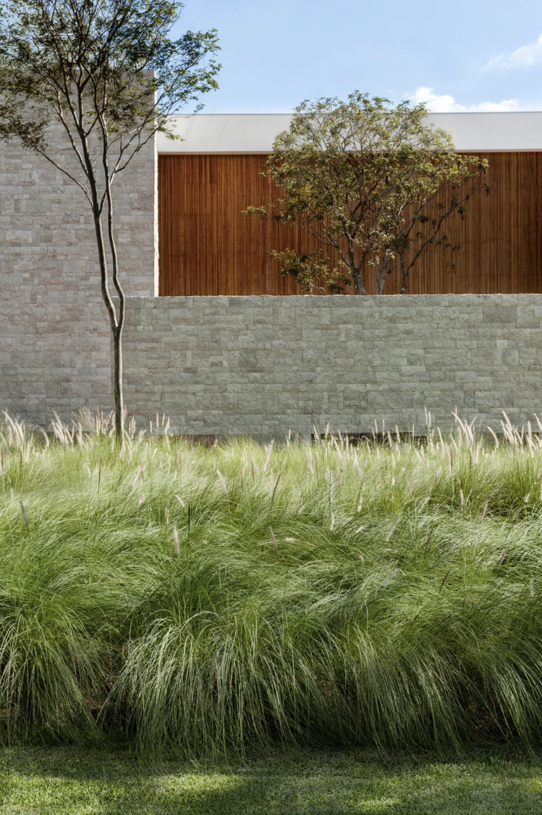 這是一個度假別墅,客戶要求休閑空間與現(xiàn)代風景的景觀相呼應。居民受到一個前花園的歡迎,其中觀賞草提供了輕盈感覺;草 巴西的鐵木樹種植在這個前花園里,最終將形成一個合并到周圍現(xiàn)有樹木的樹冠。
