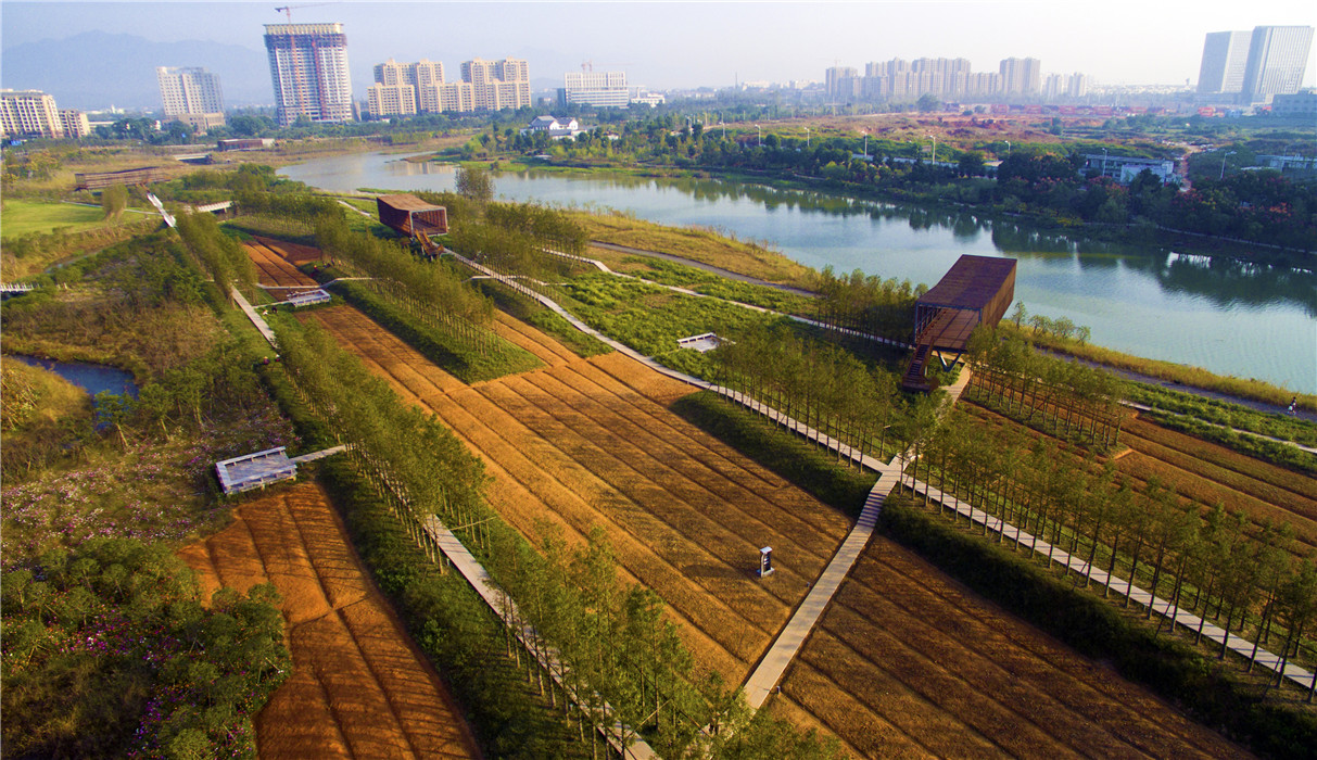 衢州鹿鳴公園位于衢州市西區(qū)石梁溪西岸,處于擁有250萬(wàn)人口的衢州市的新城中心(商業(yè)、行政中心)之核心地段,是高密度城市建筑之中的一片“綠洲”。設(shè)計(jì)師將具有生產(chǎn)性的農(nóng)業(yè)景觀與低維護(hù)的鄉(xiāng)土植物融于景觀設(shè)計(jì)之中,創(chuàng)造出一個(gè)豐產(chǎn)而美麗的城市公園。一系列漂浮于植被和溪水之上的步行道、棧橋和亭臺(tái)等構(gòu)成一個(gè)游憩網(wǎng)絡(luò),讓人悠游于山水自然之中,而又不給自然過(guò)程造成過(guò)度的干擾。城市遺棄地由此轉(zhuǎn)變成豐產(chǎn)而美麗的景觀,同時(shí)保留了場(chǎng)地的生態(tài)特色與文化遺產(chǎn)。通過(guò)探索人工建設(shè)與自然元素的平衡,實(shí)現(xiàn)人與自然的和諧共生。