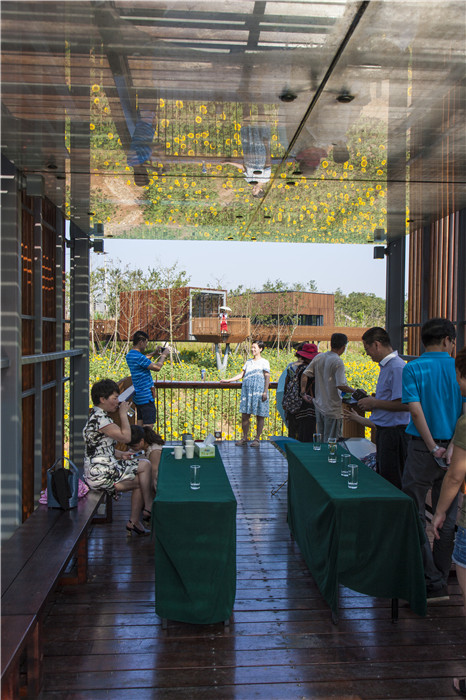 (4)山水之上的體驗(yàn)框架:通過(guò)棧橋、步道系統(tǒng),及多處亭臺(tái),組成環(huán)形的游覽網(wǎng)絡(luò),為游客創(chuàng)造了豐富的景觀游賞體驗(yàn)。場(chǎng)地中遺留下的涼亭,原是為田間勞作的農(nóng)人提供午餐和休憩的地方,為公園的涼亭的設(shè)計(jì)帶來(lái)啟發(fā),使它們帶有鄉(xiāng)土特征。此外,整套步道網(wǎng)絡(luò)漂浮于斑斕的景觀之上,一步一景,成功地將生產(chǎn)性植被和絢麗自然風(fēng)光,轉(zhuǎn)變成游客可直觀體驗(yàn)的多層次的互動(dòng)游賞。