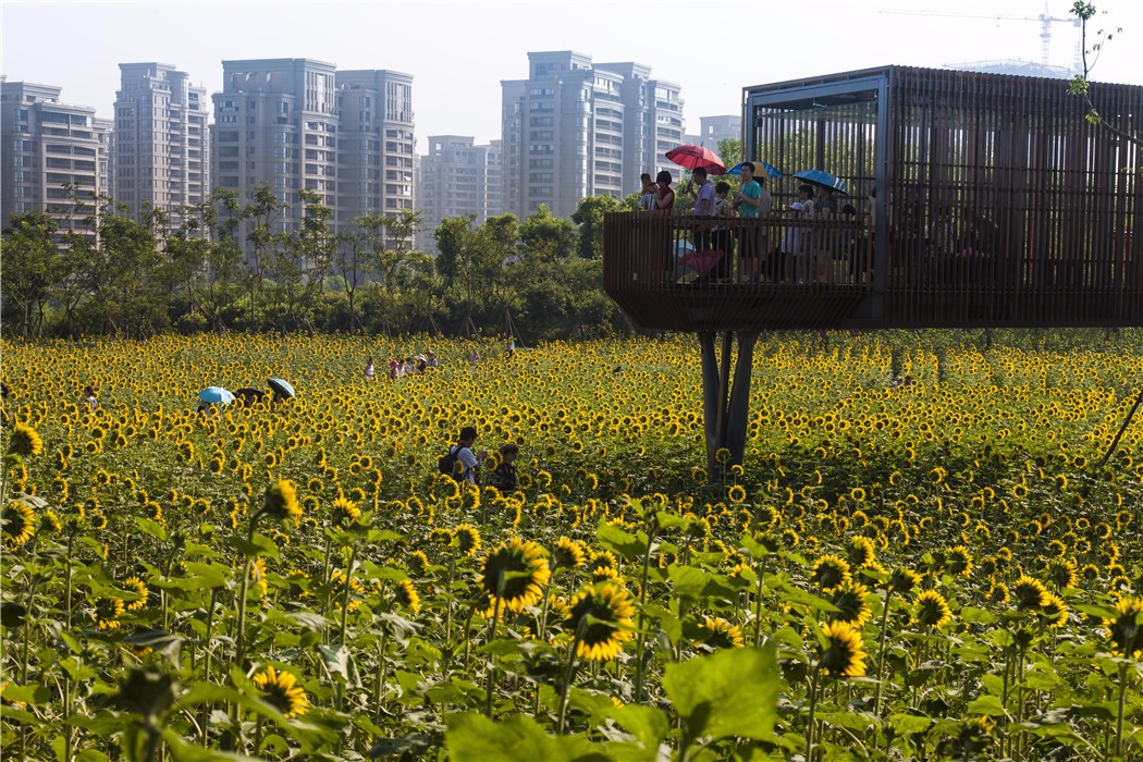 (2)豐產(chǎn)而富變化的都市田園:在保留原有地植被的基礎(chǔ)之上,廢棄地上引植了生產(chǎn)性作物,四季輪作:春天是油菜花,夏季和秋日是向日葵,以及早冬的蕎麥,并輪作了絢麗的草本野花。草甸上一片片低維護(hù)的野菊花是很好的中藥材料。同時(shí),還有兩處大草坪供人們露營(yíng)、運(yùn)動(dòng)、兒童嬉戲等各類活動(dòng)的開展。豐產(chǎn)而美麗的植物設(shè)計(jì),吸引著人們?cè)诓煌募竟?jié)到園中舉行豐富多彩的活動(dòng);四季的綠草花香也融入了市民們的日常生活。