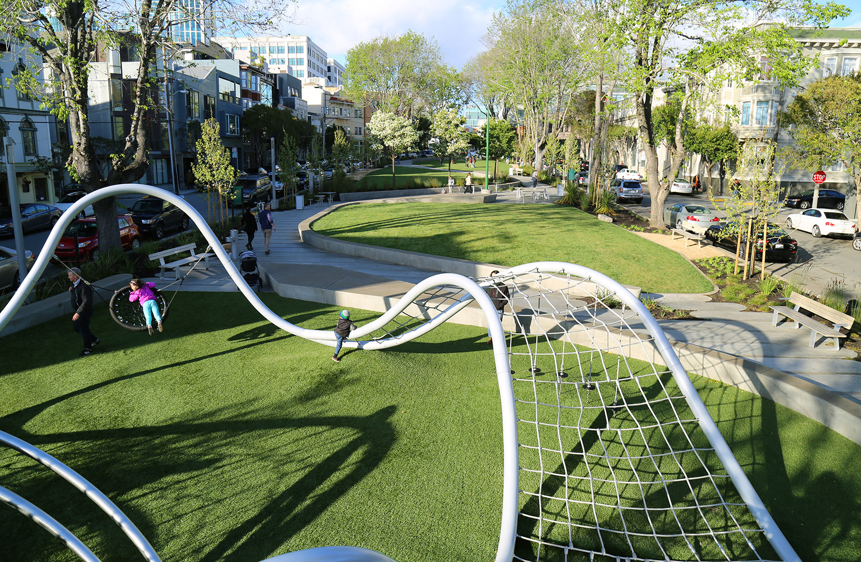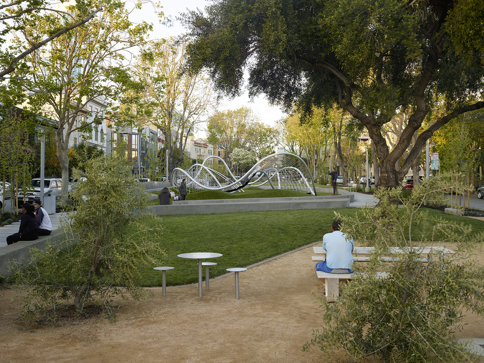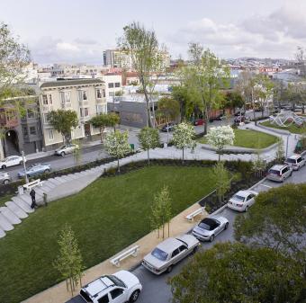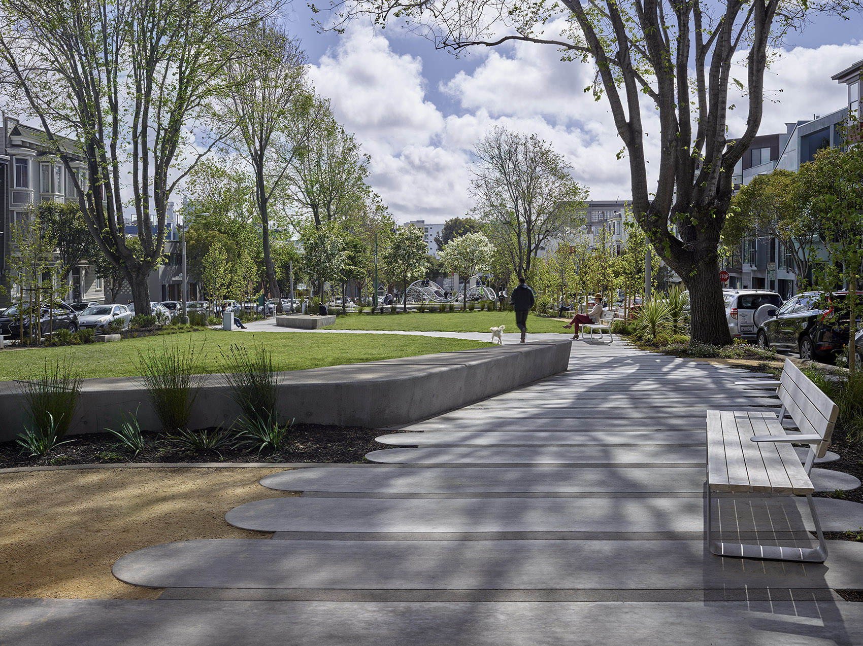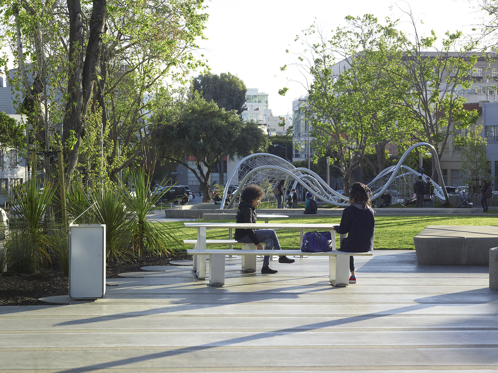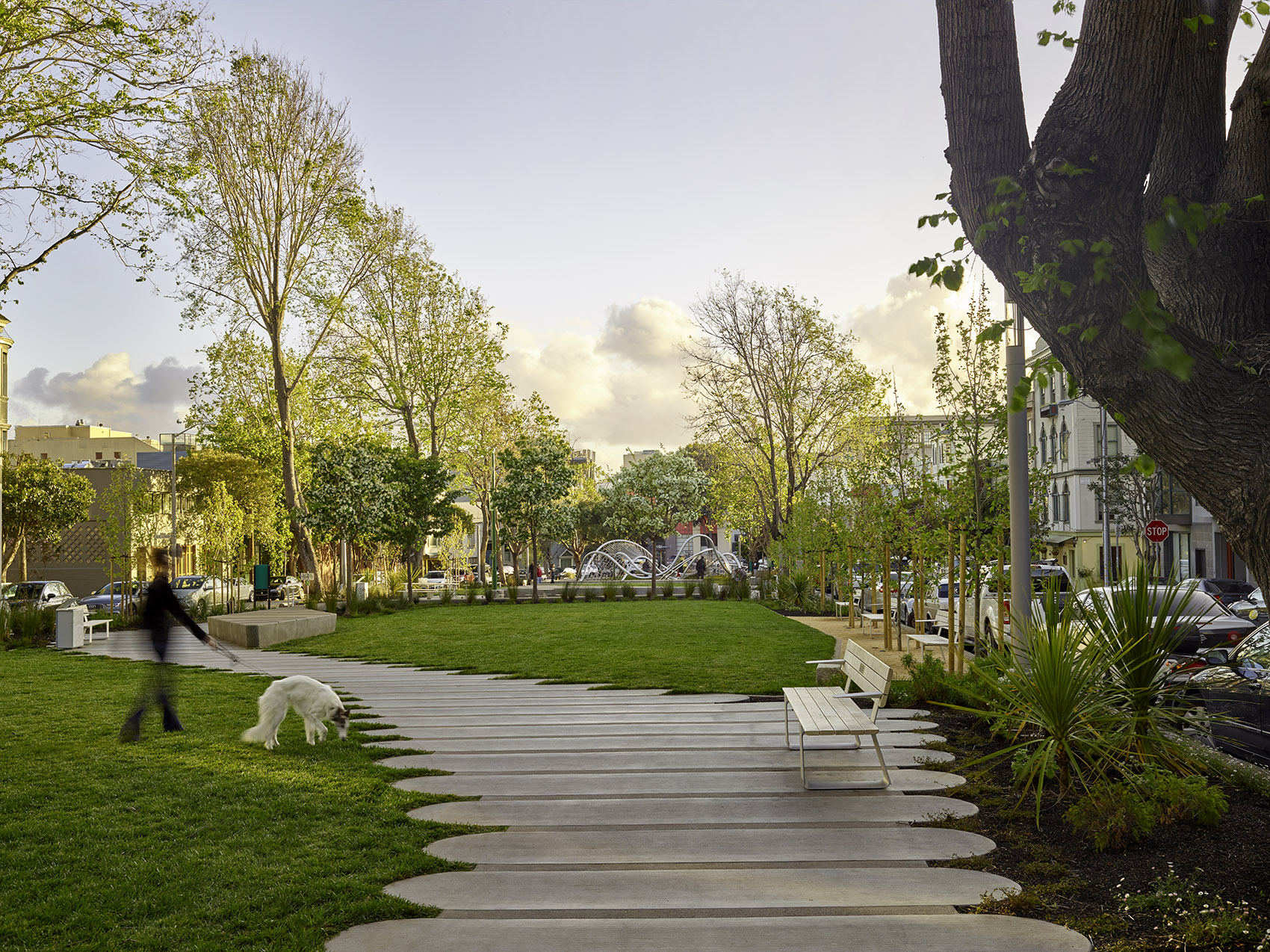 在南花園發(fā)展委員會(huì),舊金山公園聯(lián)盟組織,舊金山公園及娛樂(lè)委員會(huì)以及舊金山公共工程組織的協(xié)助下,F(xiàn)letcher Studio為舊金山營(yíng)造了全新的城市公共休閑景觀,并通過(guò)該景觀實(shí)現(xiàn)了該區(qū)的無(wú)信號(hào)燈交通管控,保證了步行交通的安全性,并以生態(tài)滲透的方式解決了污水排放及處理問(wèn)題。該設(shè)計(jì)采用系統(tǒng)化的城市分析方法對(duì)土地利用,環(huán)流模式,植被現(xiàn)狀和污水系統(tǒng)進(jìn)行分析,并采用模塊化可膨脹的地面鋪裝,大型坡地草坪,植被滲透盆地和種植場(chǎng)地這四個(gè)緊密相關(guān)的設(shè)計(jì)元素,實(shí)現(xiàn)南花園的優(yōu)秀景觀規(guī)劃。