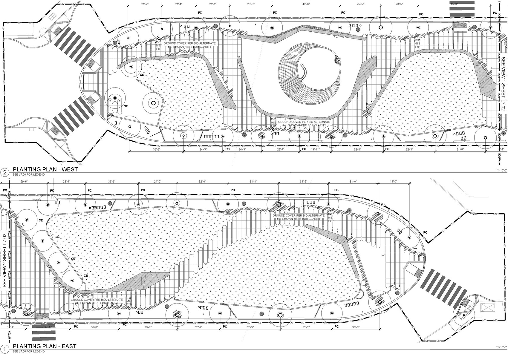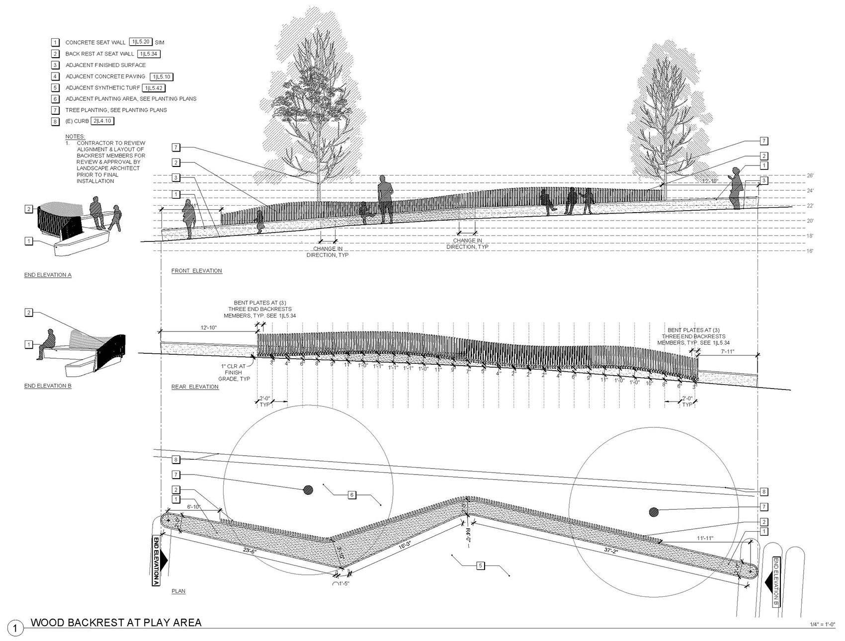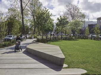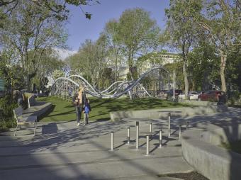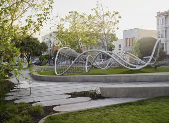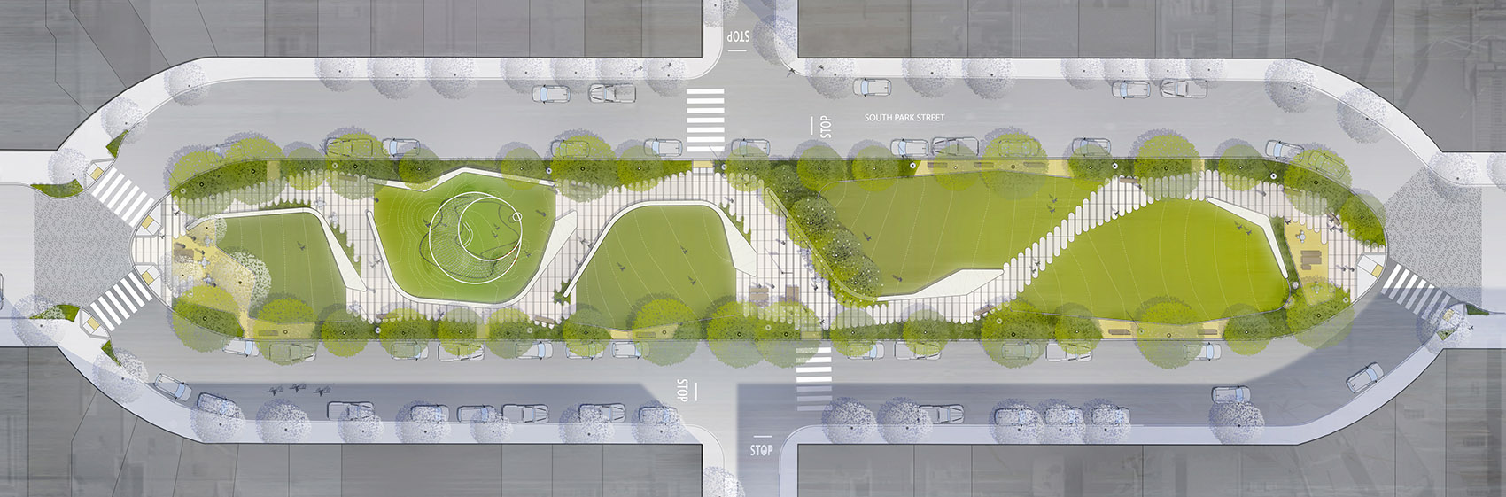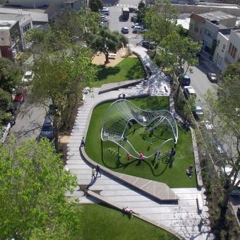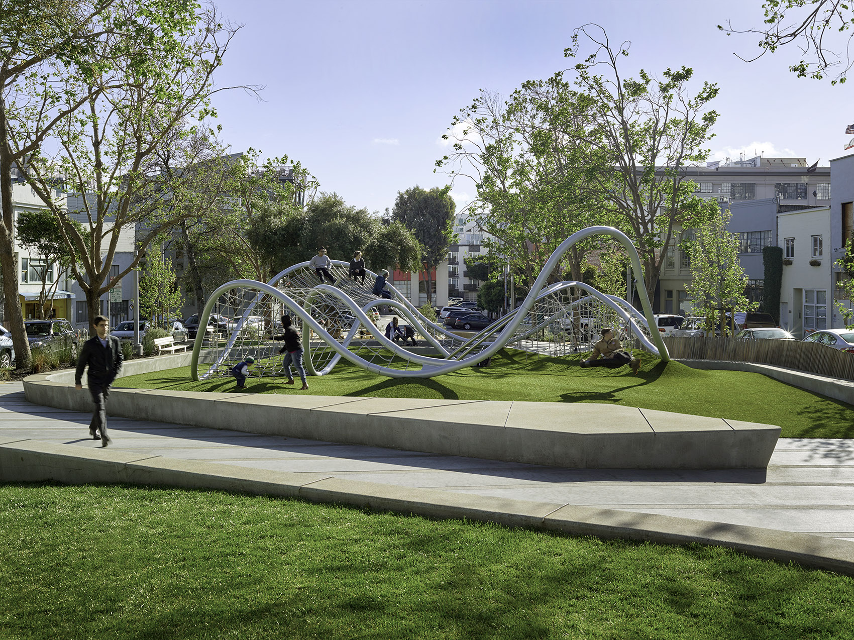 在南花園發(fā)展委員會(huì),舊金山公園聯(lián)盟組織,舊金山公園及娛樂(lè)委員會(huì)以及舊金山公共工程組織的協(xié)助下,F(xiàn)letcher Studio為舊金山營(yíng)造了全新的城市公共休閑景觀,并通過(guò)該景觀實(shí)現(xiàn)了該區(qū)的無(wú)信號(hào)燈交通管控,保證了步行交通的安全性,并以生態(tài)滲透的方式解決了污水排放及處理問(wèn)題。該設(shè)計(jì)采用系統(tǒng)化的城市分析方法對(duì)土地利用,環(huán)流模式,植被現(xiàn)狀和污水系統(tǒng)進(jìn)行分析,并采用模塊化可膨脹的地面鋪裝,大型坡地草坪,植被滲透盆地和種植場(chǎng)地這四個(gè)緊密相關(guān)的設(shè)計(jì)元素,實(shí)現(xiàn)南花園的優(yōu)秀景觀規(guī)劃。