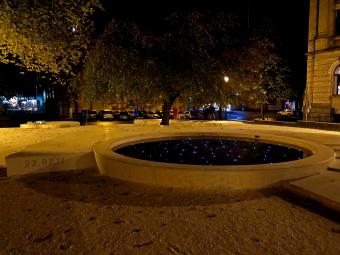 ▼代表著77名遇難者的電光源在深夜的水池中被點亮