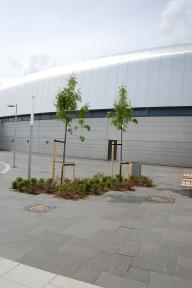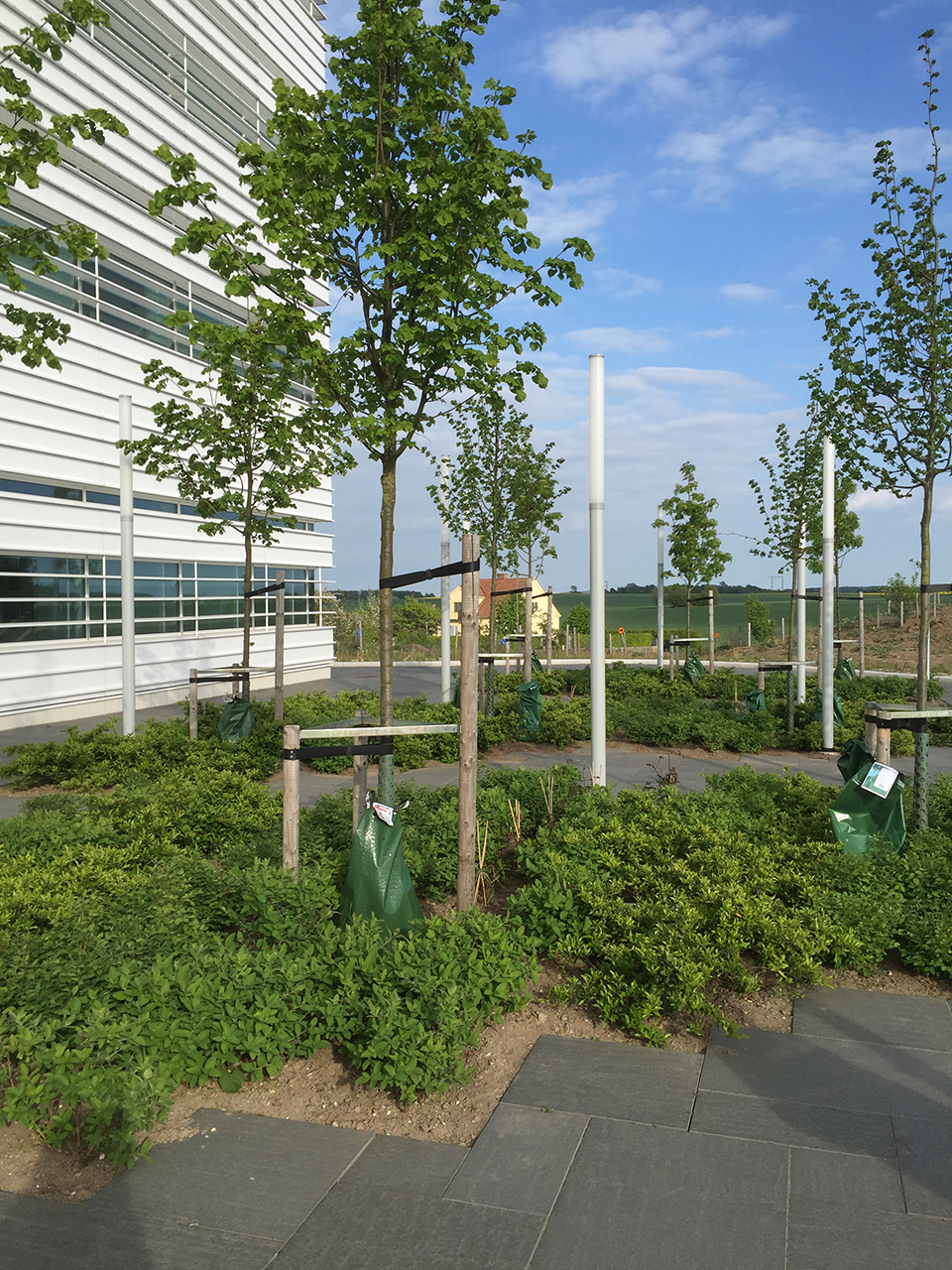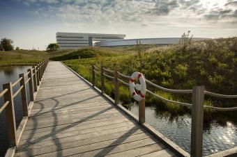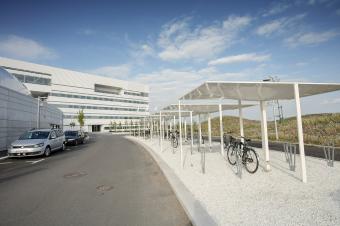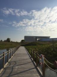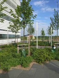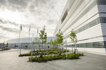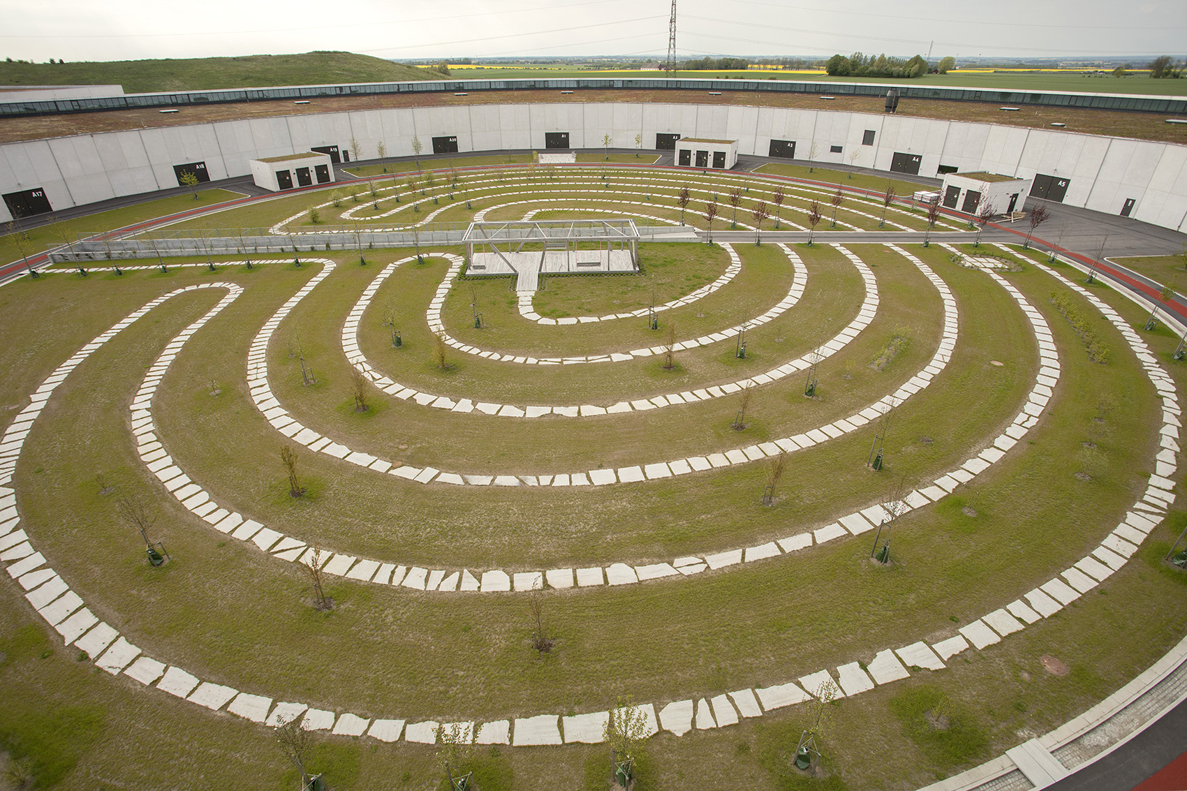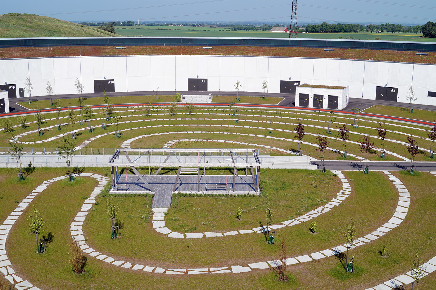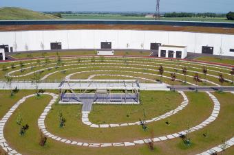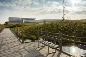 該景觀(guān)依據(jù)實(shí)驗(yàn)室內(nèi)部的一系列獨(dú)特參數(shù)而設(shè)計(jì),試圖輔助設(shè)備的運(yùn)行性能。相應(yīng)的措施包括,通過(guò)景觀(guān)設(shè)計(jì)減輕來(lái)自附近高速公路的地面振動(dòng),增設(shè)雨水管理以及促進(jìn)城市可持續(xù)發(fā)展等。