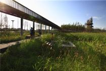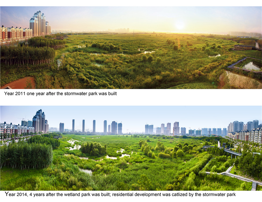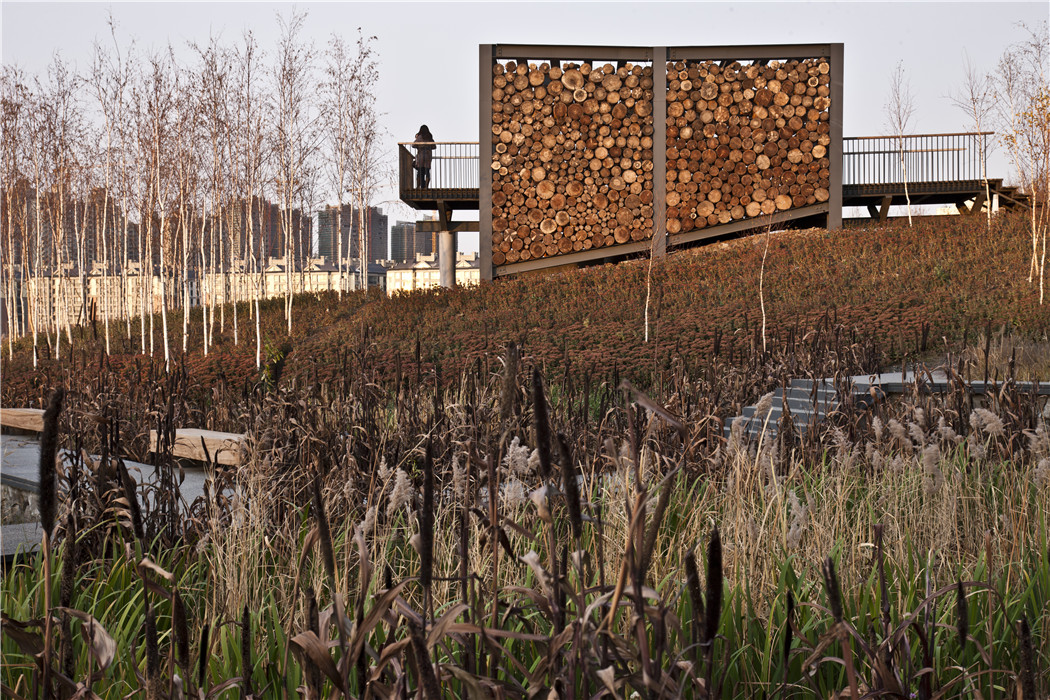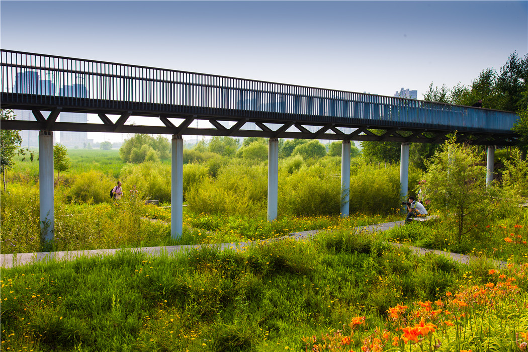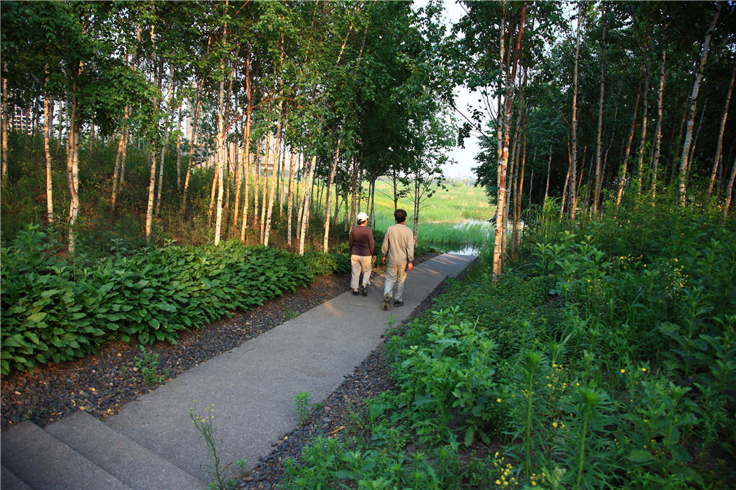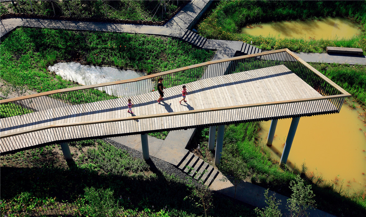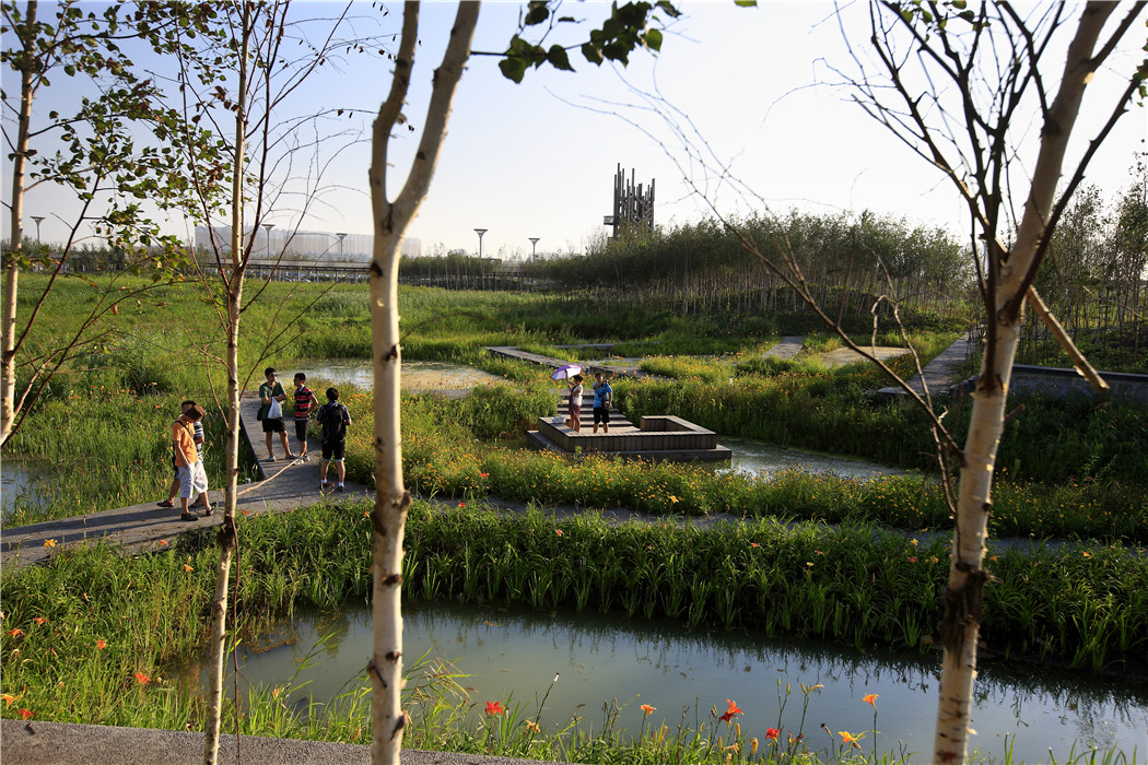 2009年中,受當(dāng)?shù)卣?,北京土人景觀承擔(dān)了這個(gè)新城中心一個(gè)主要公園的設(shè)計(jì),占地34.2公頃,原為一塊被保護(hù)的區(qū)域濕地。受周邊道路建設(shè)和高密度城市發(fā)展的影響,濕地面臨著嚴(yán)重威脅。最初委托方只要求設(shè)計(jì)師能想辦法維護(hù)濕地的存在,土人的設(shè)計(jì)改變了為保護(hù)而保護(hù)的單一目標(biāo),而是從解決城市問(wèn)題出發(fā),利用城市雨洪,將公園轉(zhuǎn)化為城市雨洪公園,從而為城市提供了多重生態(tài)系統(tǒng)服務(wù):它可以收集、凈化和儲(chǔ)存雨水,經(jīng)濕地凈化后的雨水補(bǔ)充地下水含水層。由于在生態(tài)和生物條件上的改進(jìn),該雨洪公園不僅成為城市中一個(gè)很受歡迎的游戲綠地,并從省級(jí)濕地公園晉升為國(guó)家級(jí)城市濕地。