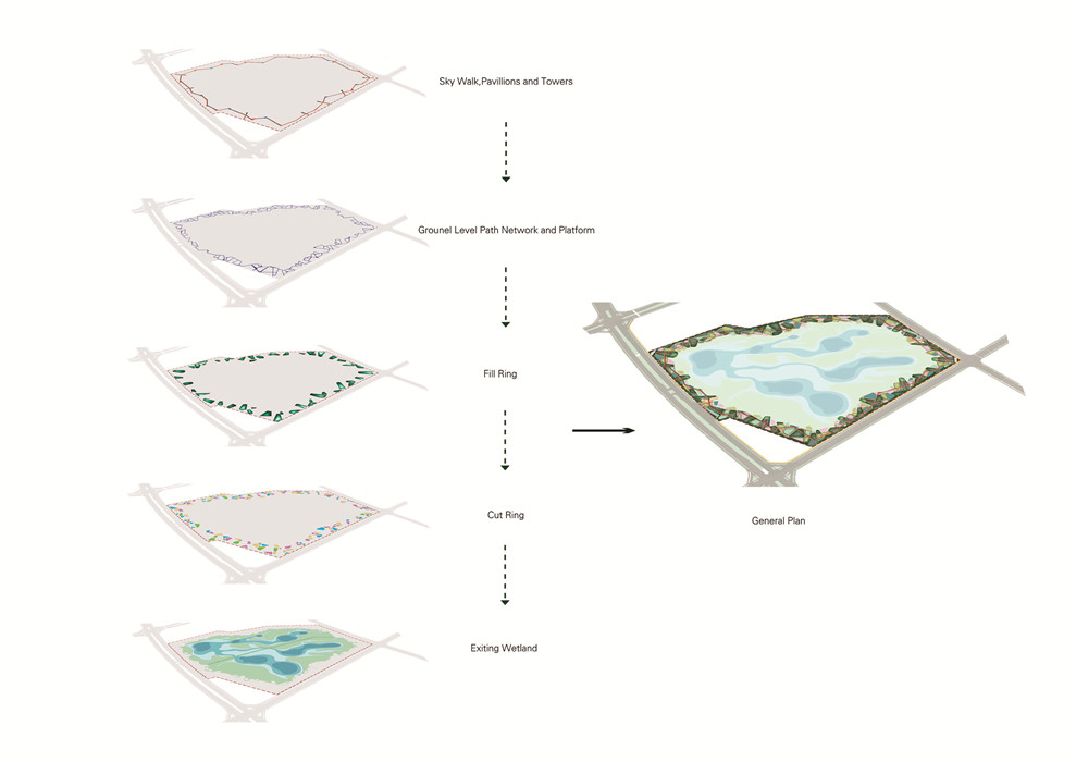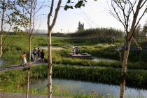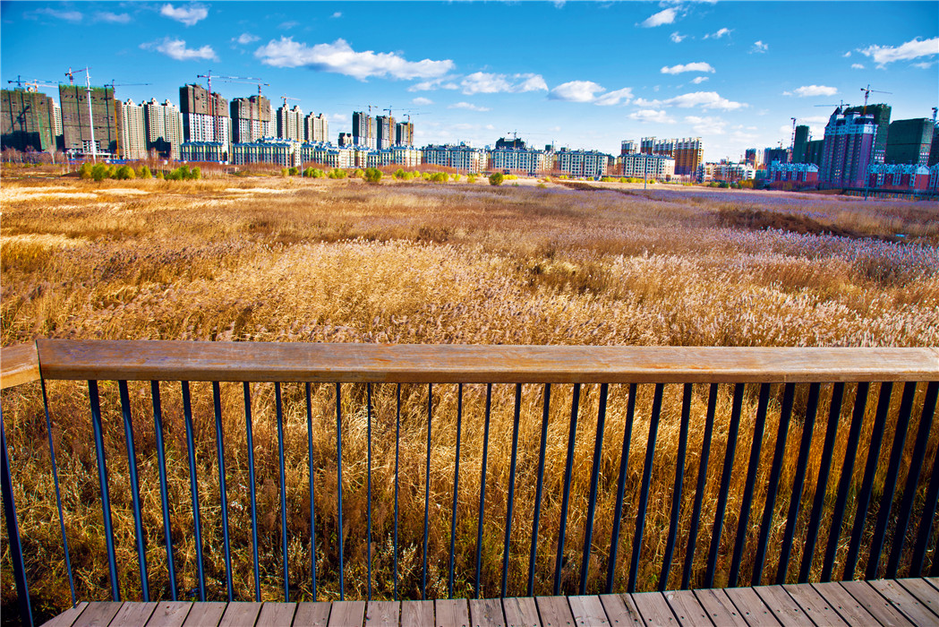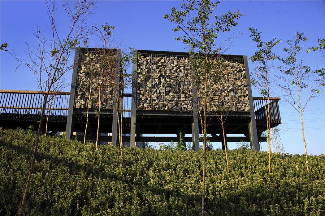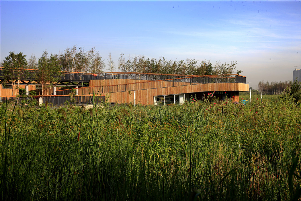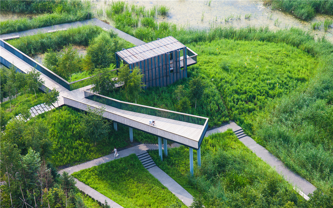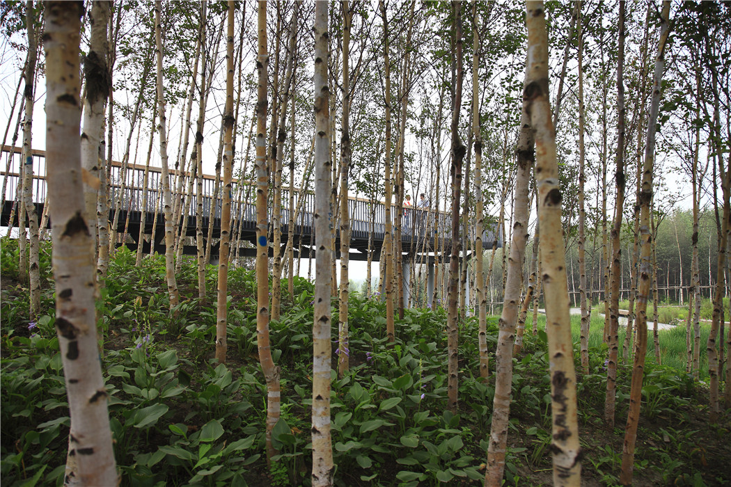 2009年中,受當(dāng)?shù)卣?,北京土人景觀承擔(dān)了這個(gè)新城中心一個(gè)主要公園的設(shè)計(jì),占地34.2公頃,原為一塊被保護(hù)的區(qū)域濕地。受周邊道路建設(shè)和高密度城市發(fā)展的影響,濕地面臨著嚴(yán)重威脅。最初委托方只要求設(shè)計(jì)師能想辦法維護(hù)濕地的存在,土人的設(shè)計(jì)改變了為保護(hù)而保護(hù)的單一目標(biāo),而是從解決城市問(wèn)題出發(fā),利用城市雨洪,將公園轉(zhuǎn)化為城市雨洪公園,從而為城市提供了多重生態(tài)系統(tǒng)服務(wù):它可以收集、凈化和儲(chǔ)存雨水,經(jīng)濕地凈化后的雨水補(bǔ)充地下水含水層。由于在生態(tài)和生物條件上的改進(jìn),該雨洪公園不僅成為城市中一個(gè)很受歡迎的游戲綠地,并從省級(jí)濕地公園晉升為國(guó)家級(jí)城市濕地。