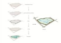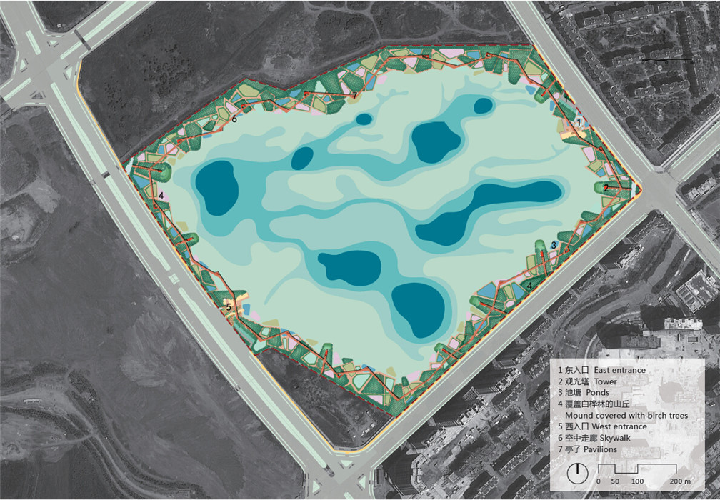2. 沿四周通過(guò)挖填方的平衡技術(shù),創(chuàng)造出一系列深淺不一的水坑和高低不一的土丘,成為一條藍(lán)-綠寶石項(xiàng)鏈,作為核心濕地雨水過(guò)濾和凈化的緩沖區(qū),形成自然與城市之間的一層過(guò)濾膜和體驗(yàn)界面。沿濕地四周布置雨水進(jìn)水管,收集新城市區(qū)的雨水,使其經(jīng)過(guò)水泡系統(tǒng),沉淀和過(guò)濾后進(jìn)入核心區(qū)的自然濕地。不同深度的水泡為鄉(xiāng)土水生和濕生植物群落提供多樣的棲息地,開啟自然演替進(jìn)程。高低不同的土丘上密植白樺林(Betula pendula),步道網(wǎng)絡(luò)穿梭于丘林和水泡之間,給游客帶來(lái)穿越林地的體驗(yàn)。水泡中設(shè)臨水平臺(tái)和座椅,使人們更加貼近自然。