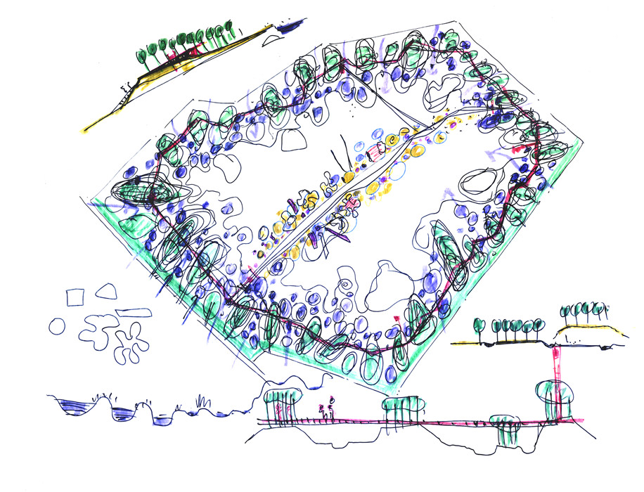 ▲ 雨水的流向及通過(guò)公園周圍生態(tài)泡的過(guò)濾過(guò)程 The filtration of storm water through the ponds in the periphery of the park.