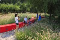 在此基礎(chǔ)上豐富鄉(xiāng)土物種,包括增加水生和濕生植物,形成一個(gè)鄉(xiāng)土植被的綠色基底。保留原有基底的平面和機(jī)理,以禾本科和莎草科的鄉(xiāng)土草本植物展示為主。帶狀機(jī)理上,以白砂為基底的場(chǎng)地上,種植草塊及成排的喬木、柿樹(shù)、白蠟,給場(chǎng)地帶來(lái)明顯的季節(jié)特色,形成許多靈活宜人的小空間。場(chǎng)地周邊保留了大量楊樹(shù)林、槐樹(shù)林,適當(dāng)補(bǔ)植同種植物,以達(dá)到林木繁茂的景觀(guān)效果,園內(nèi)設(shè)置了休憩的茶座,供人賞花觀(guān)草、品茶休憩。。在原東岸北側(cè)堆料場(chǎng)改為宿根植物園區(qū),通過(guò)宿根花卉的不同色彩,構(gòu)成白色、藍(lán)紫色、橙黃色和紅粉色四個(gè)花園,周邊包圍著茂密的樹(shù)林,營(yíng)造宜人的氣氛。區(qū)域內(nèi)除了展示宿根花卉外,還利用場(chǎng)地內(nèi)原有料場(chǎng)的建筑基底,設(shè)置茶室和景區(qū)服務(wù)中心,提供多樣服務(wù),同時(shí),沿道路設(shè)置自然主題的陰棚和花架。人們?cè)谄凡栊蓓耐瑫r(shí)得到更多的視覺(jué)享受,了解到更多的植物知識(shí)。草本植物園也是在原有建筑基底中恢復(fù)出來(lái)的,位于場(chǎng)地西岸的北端,與宿根植物園隔河相望。