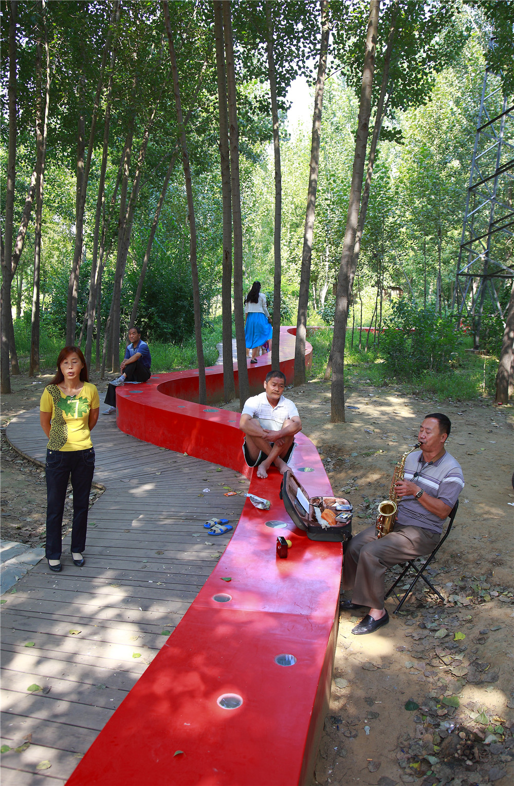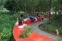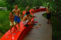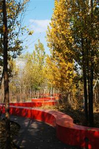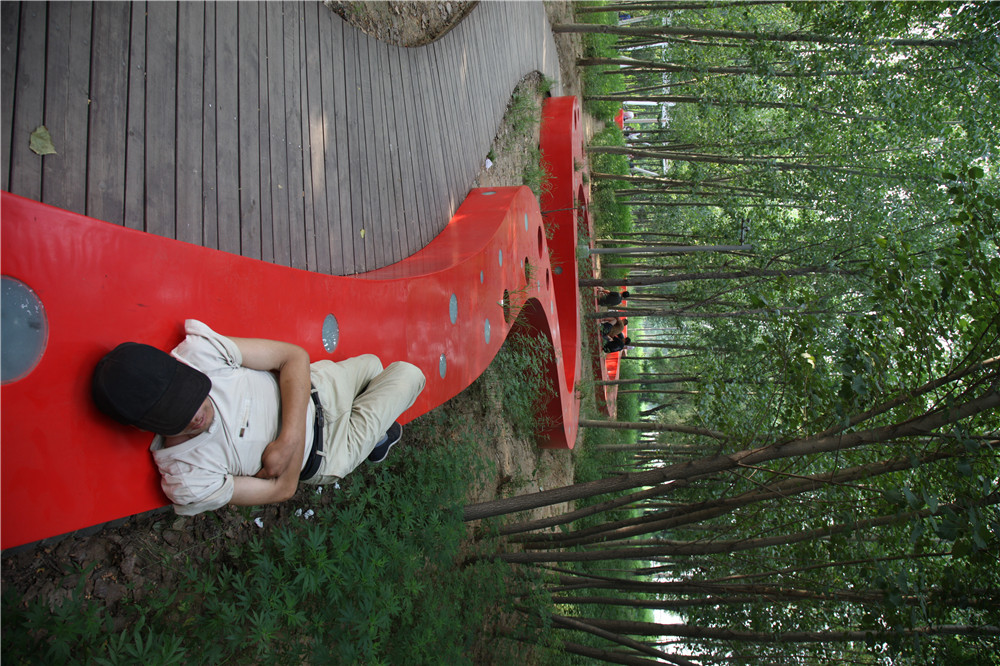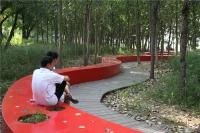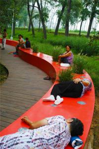 湯河公園最大程度的保留場(chǎng)地原生植被,也保護(hù)了原生自然系統(tǒng)的生態(tài)服務(wù)。據(jù)粗略推算,湯河公園綠地每年對(duì)SO2的吸收的數(shù)量為6t,綠地的滯塵量為218t,吸收CO2的數(shù)量為320t,放出O2的數(shù)量為240t,吸收NOx的數(shù)量為7.6t(張素娟等,2008)。建成后,我們開(kāi)展了相關(guān)的使用后評(píng)價(jià)調(diào)查,公園景觀(guān)整體環(huán)境滿(mǎn)意度高,“紅飄帶”和周?chē)艿臉?shù)林構(gòu)成了吸引游人的大環(huán)境,它的長(zhǎng)度與連貫性營(yíng)造了一個(gè)親切的聚會(huì)空間,坐等后面的樹(shù)林給人增加了安全感與領(lǐng)域性,且面對(duì)湖面,視野開(kāi)闊,深受大家喜愛(ài)(徐艷玲等,2011)。