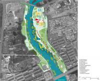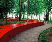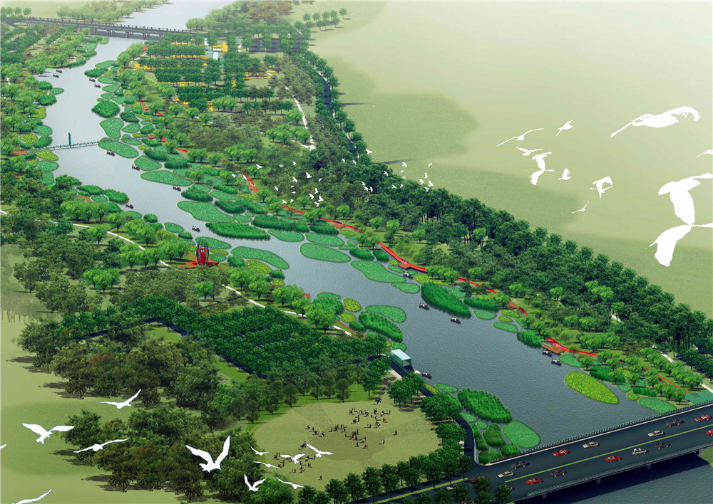 設(shè)計(jì)方案最終實(shí)現(xiàn)了城市化過(guò)程中對(duì)自然河道的保護(hù),保留自然河流的綠色與藍(lán)色基底,最少量的改變?cè)械匦魏椭脖灰约皻v史遺留的人文痕跡,同時(shí),滿(mǎn)足城市人的休閑活動(dòng)需要,藝術(shù)的創(chuàng)造了一種當(dāng)代人的景觀(guān)體驗(yàn)空間。最具特色的是,方案在完全保留原有河流生態(tài)廊道的綠色基底上,引入一條以鋼為材料的紅色飄帶。它整合了包括漫步、環(huán)境解釋系統(tǒng)、鄉(xiāng)土植物標(biāo)本種植、燈光等功能和設(shè)施的需求,用最小的干預(yù),獲得都市人對(duì)綠色環(huán)境的最大需求。