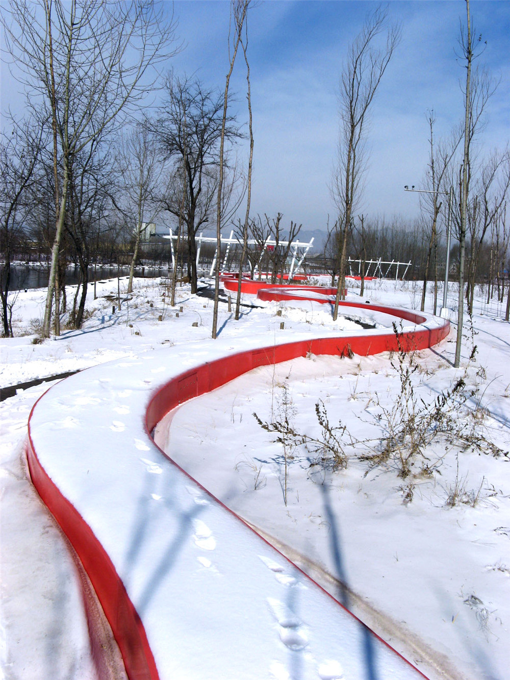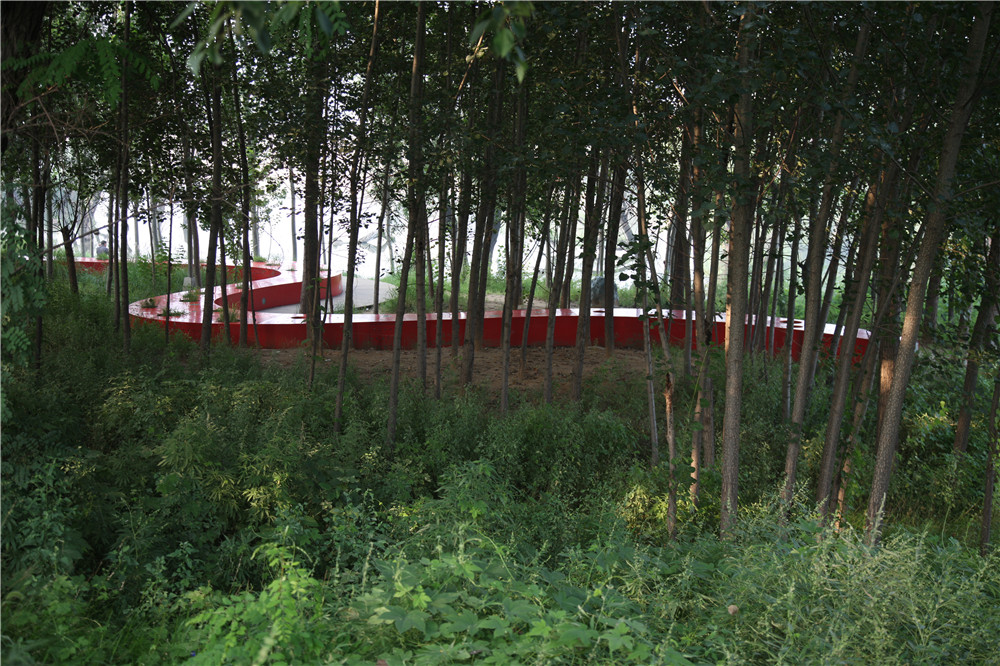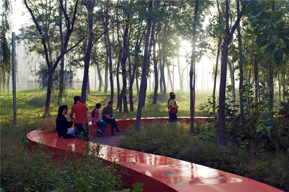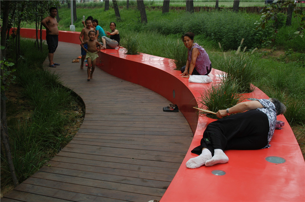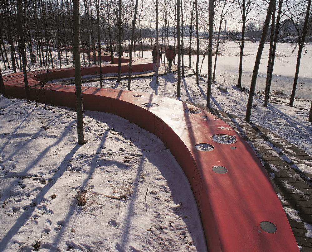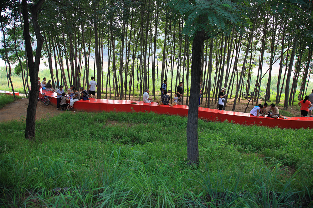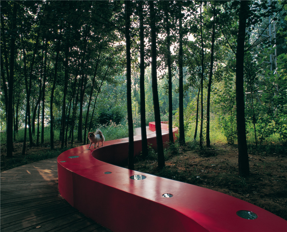 本案例展示了如何用最少的干預(yù),藝術(shù)的介入,使流進(jìn)城市的河漫灘便成為城市公園。項(xiàng)目中,原有河漫灘的植被和棲息地得到最大限度的保留,在此自然本底之上,引入一條紅色飄帶---坐凳,并結(jié)合架空的木棧道。