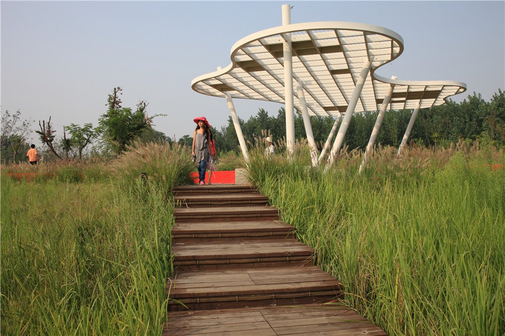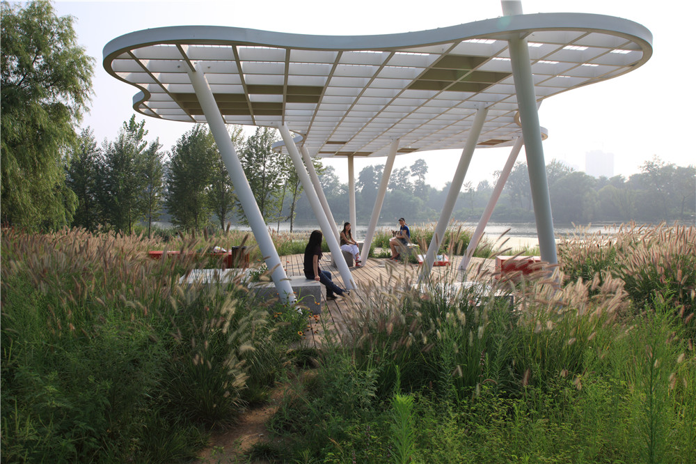 沿紅飄帶,分布四個(gè)節(jié)點(diǎn),分別以四種鄉(xiāng)土野草為主題“桂花亭、蘆葦亭、銀草亭、狼尾草亭”。每個(gè)節(jié)點(diǎn)都有一個(gè)如“云”的天棚。網(wǎng)架上局部遮擋,有虛實(shí)變化,具有遮蔭、擋雨的功能。夜間整個(gè)棚架發(fā)出點(diǎn)點(diǎn)星光,創(chuàng)造出一種溫馨的童話(huà)氛圍;斜柱如林木;地上鋪裝呼應(yīng)天棚的投影;在這天與地之間是人的活動(dòng)和休息空間和鄉(xiāng)土植物的展示空間。在最大限度地保留自然生態(tài)系統(tǒng)的同時(shí),獲得了最大程度的“城市化”。