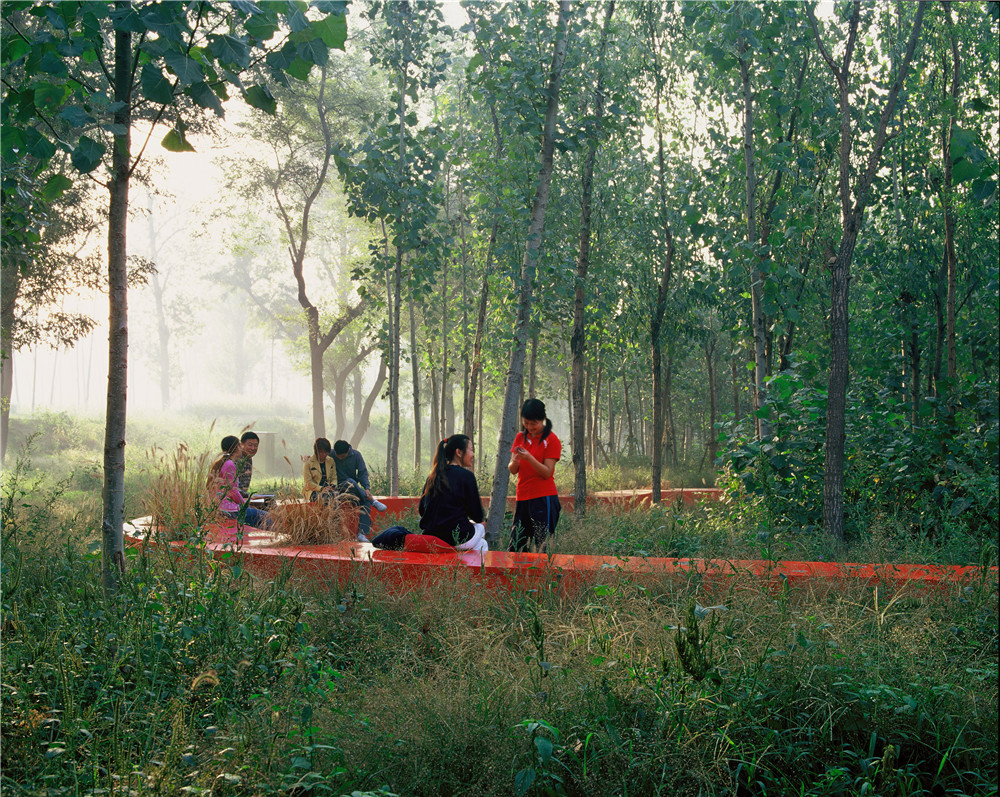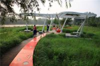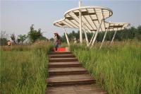 沿河兩岸都設(shè)有自行車(chē)道和步行道,并與城市道路系統(tǒng)相聯(lián)系,以最少的干預(yù)增加了場(chǎng)地的可達(dá)性,滿(mǎn)足必要的交通服務(wù)要求。木棧道或穿越林叢或跨越濕地,使得公園成為漫步者的天堂。場(chǎng)地原有一條土路可供自行車(chē)穿越,自行車(chē)道的建立可在遠(yuǎn)期起到引導(dǎo)市民出行方式的作用及引導(dǎo)其兩側(cè)用地性質(zhì)向城市綠地轉(zhuǎn)化的功能。自行車(chē)道旁原有廢棄灌渠被改造后重新煥發(fā)生機(jī),一部分作為游憩座椅,一部分利用成為線(xiàn)形種植溝。用最少的干預(yù),獲得都市人對(duì)綠色環(huán)境的最大需求。