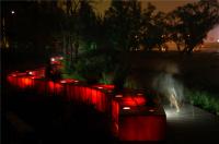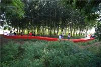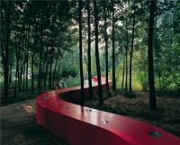 “紅飄帶”已申請(qǐng)專(zhuān)利,是一種用于組成飄帶型景觀(guān)雕塑的單節(jié)制品。構(gòu)成整體的單節(jié)制品是由玻璃鋼材料制成的單節(jié)殼體,在單節(jié)殼體的兩端內(nèi)側(cè)設(shè)有與內(nèi)法蘭平行布置的鋼骨架,用于增強(qiáng)殼體的強(qiáng)度和殼體與地基的安裝連接,在單節(jié)殼體的頂面開(kāi)有頂燈孔和綠化池,在單節(jié)殼體的側(cè)面開(kāi)有側(cè)燈孔,在單節(jié)殼體內(nèi)安裝有與頂燈孔相對(duì)應(yīng)的頂燈光源和與側(cè)燈孔相對(duì)應(yīng)的側(cè)燈光源。在單體側(cè)旁還安裝有木棧道,將單節(jié)組件根據(jù)環(huán)境、地勢(shì)特征組合成與周?chē)h(huán)境協(xié)調(diào)一致,曲折蜿蜒,總長(zhǎng)達(dá)500m,因地形和樹(shù)木的存在而發(fā)生寬度和線(xiàn)型的變化;中國(guó)紅的色彩,點(diǎn)亮幽暗的河谷林地,造就了具有動(dòng)感效果和休閑、觀(guān)賞功能的“紅飄帶”景觀(guān)。