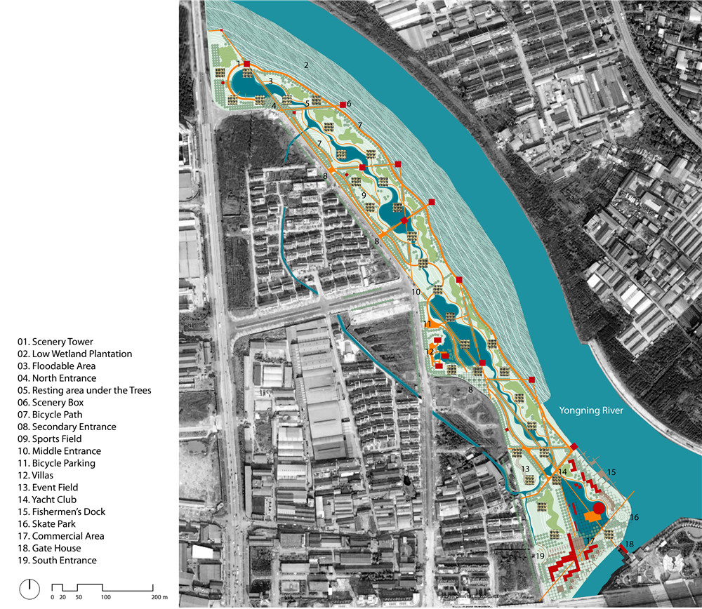 永寧江(澄江)是臺州市兩大水系之一椒江水系的最大支流,發(fā)源于黃巖西部括蒼山,流經(jīng)西部丘陵、河谷平原、新老海積平原及城市化地區(qū),向東流入椒江,全長77km,流域面積889.80km2。永寧江孕育了黃巖的自然與人文特色,堪稱山水靈秀,自古以來為道教勝地,有魚米之豐饒,又有蜜桔和為武術(shù)大行天下;現(xiàn)代則有“小狗經(jīng)濟”之源,模具之鄉(xiāng)等美譽。然而,幾十年來,人們并沒有善待這條母親河。自長潭水庫和永寧江閘建成,以及長久以來的圍墾造田(尤其是早田)和“填河,填湖”等,永寧江水文過程發(fā)生了極大的變化,逐步演變成為人工管理下的工程化河流,逐漸喪失了自然泛洪、泄洪、生物等功能。同時,河道硬化和渠化等工程措施,也導(dǎo)致河流動力過程的改變和惡化,水質(zhì)嚴重惡化,河流形態(tài)的改變,兩岸植被和生物棲息地的破壞,休閑價值損毀。永寧公園作為永寧江生態(tài)廊道的重要節(jié)點,同時也是黃巖市濱水綠地系統(tǒng)的重要組成部分,其對于永寧江防洪及黃巖市的自然、社會及文化有太多意味。如何把以防洪為單一目的的硬化河道,以最經(jīng)濟的途徑,恢復(fù)為與洪水為友的多功能水彈性景觀,便成為該設(shè)計的主要目標。