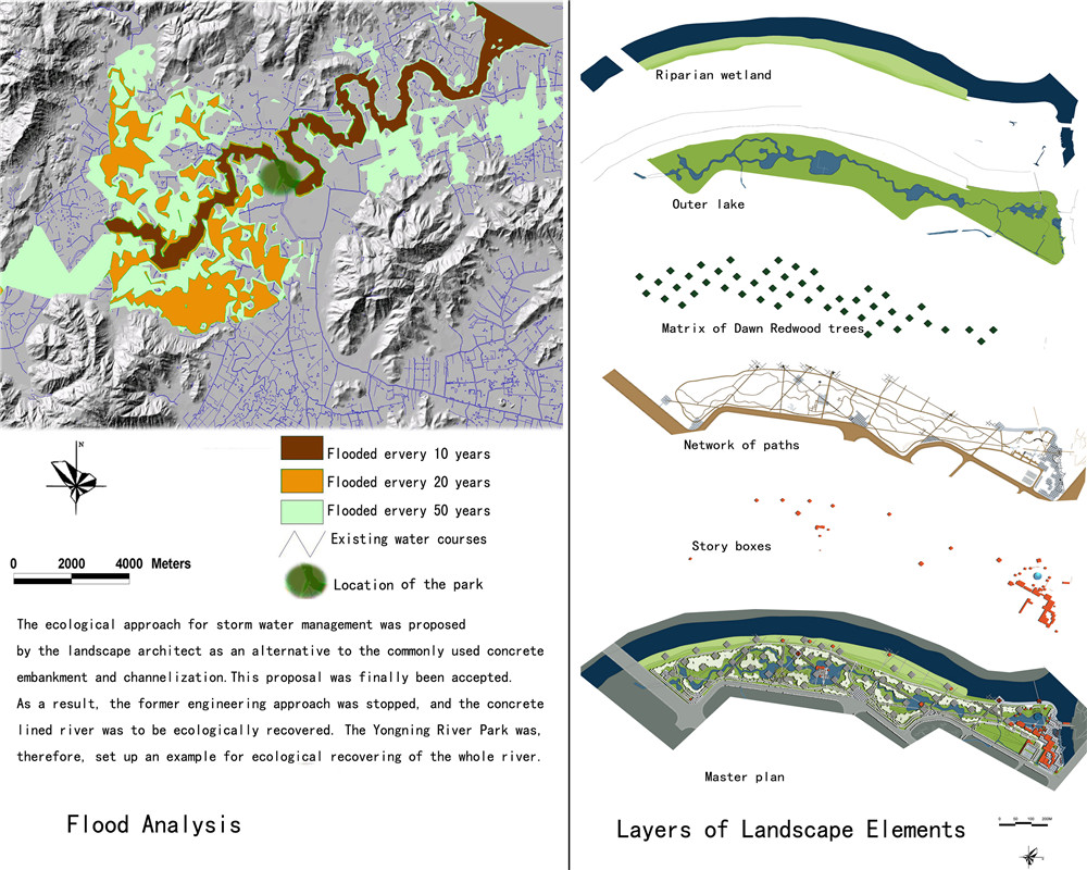 為此目標,永寧公園以“與洪水為友”的理念為指導(dǎo),采用了水彈性的設(shè)計策略,將防洪與景觀功能很好的結(jié)合在一起。其具體策略包括: