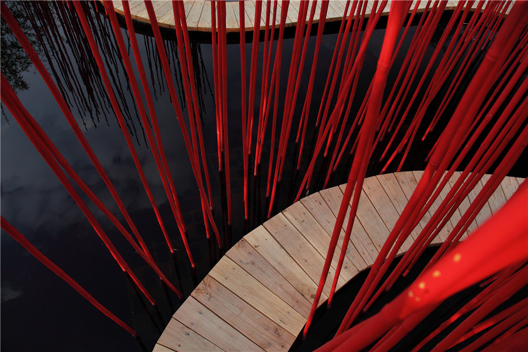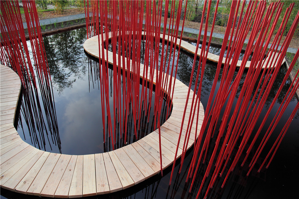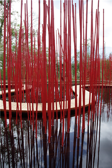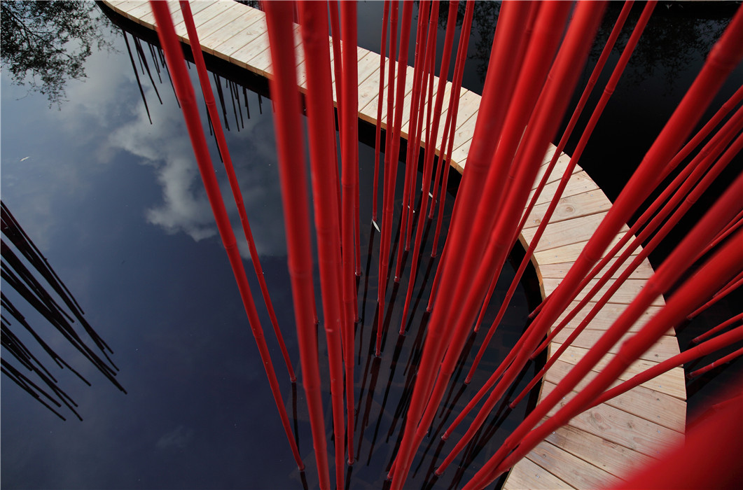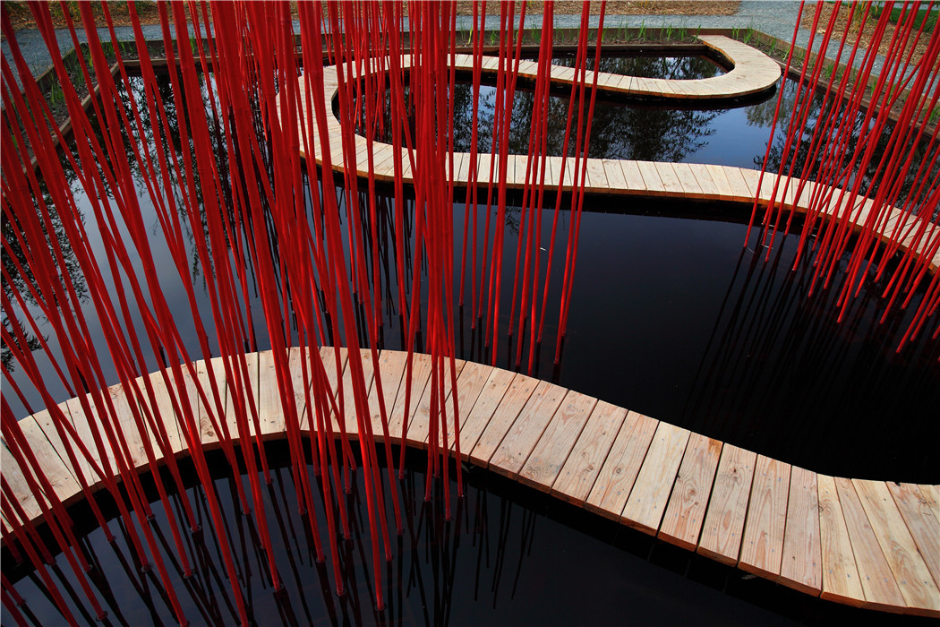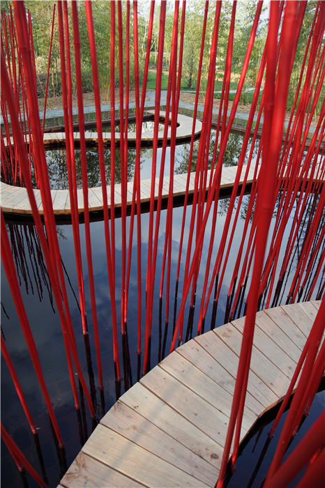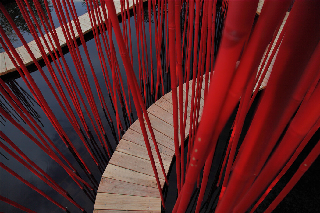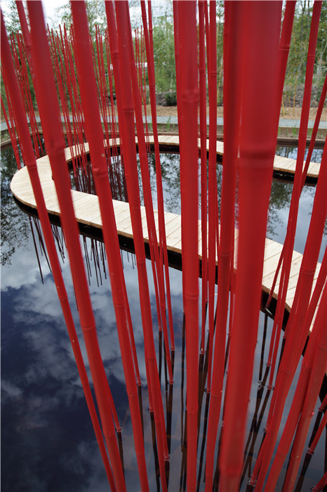 借水成景:雨水在一個很小的空間內(nèi)營造了一面鏡子,照應天光云影,使空間陡然擴大無數(shù);曲線形的木棧道對角穿越方形水池,漂浮于水面。小棧道僅50厘米寬,容一人穿行。它是“圓”的符號,也是體驗水池無限風光的路徑。水池中間是三叢紅色竹竿,它們可取之四周竹林的老桿,是可再生的材料。垂直的竹竿叢沿木棧道分布,令行走在棧道上的游客體驗穿越的快感。垂直的竹叢倒影水中,與變換的天景相輝映,創(chuàng)造出寧靜和深遠的氛圍。雖然水深只有30厘米,卻通過垂直向天的紅色竹竿,創(chuàng)造出無限深遠的感覺。方圓周邊和水中植物全部為中國植物,渲染出濃郁的中國氣氛。