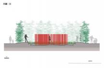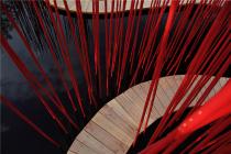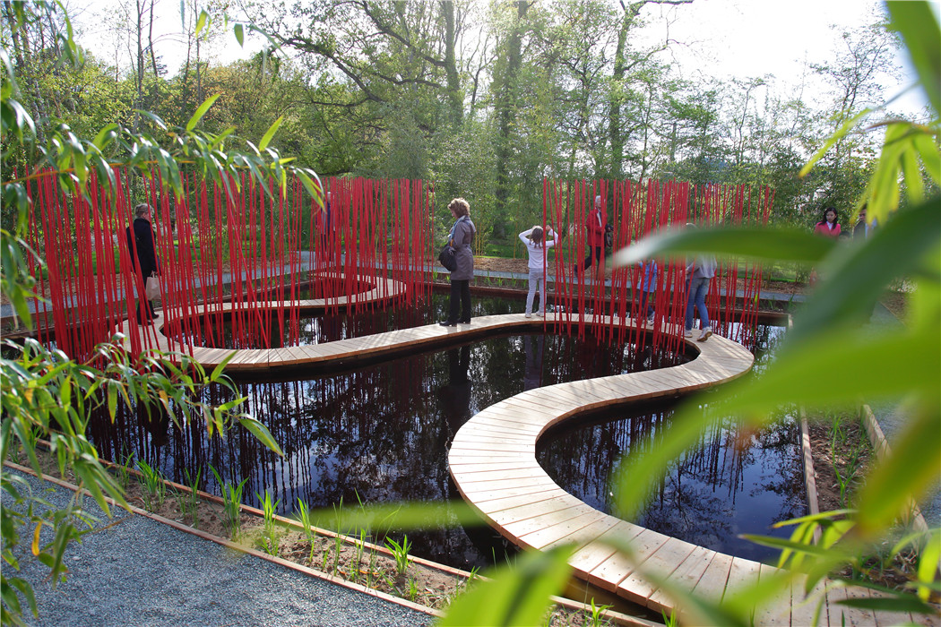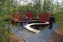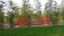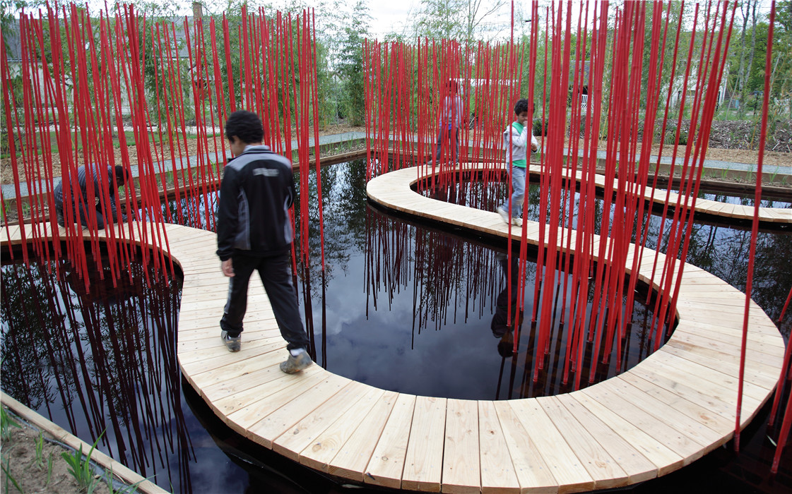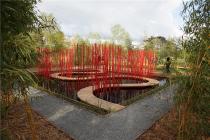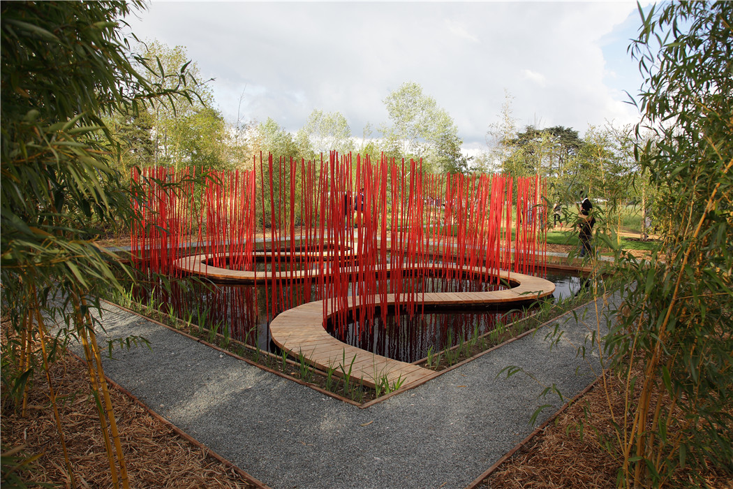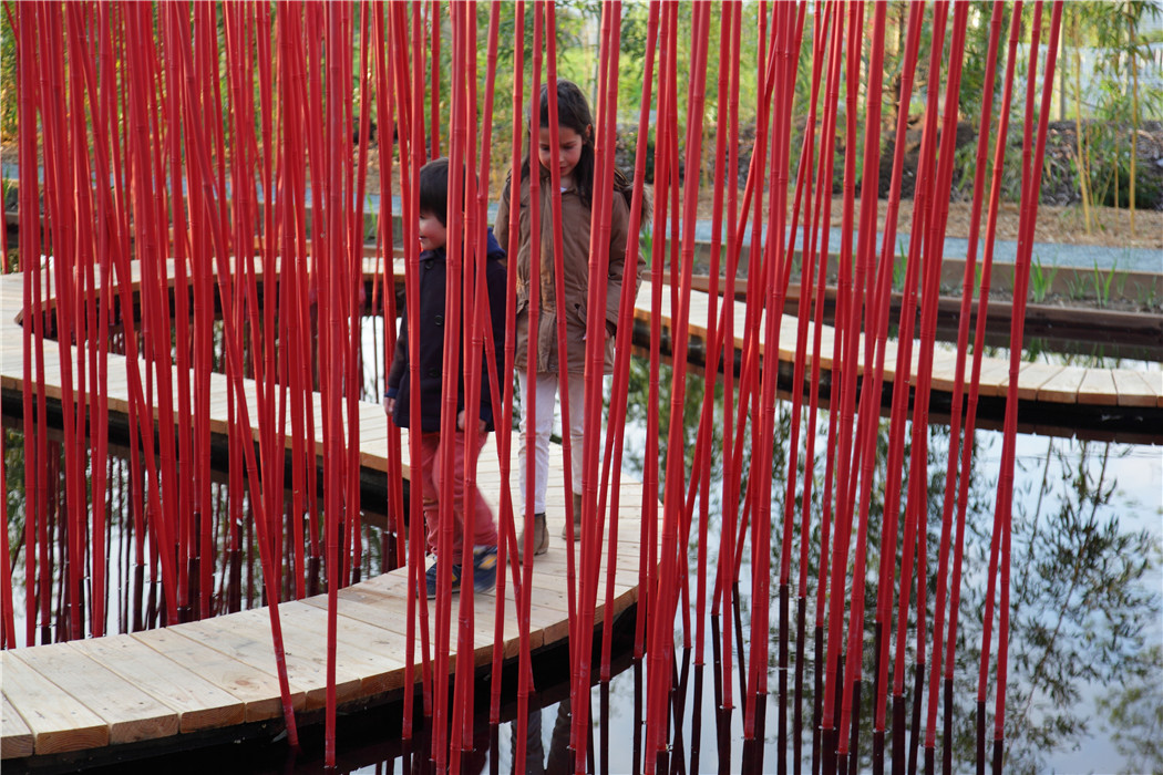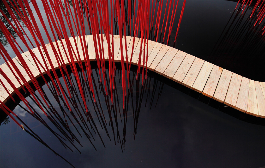 借水成景:雨水在一個很小的空間內(nèi)營造了一面鏡子,照應天光云影,使空間陡然擴大無數(shù);曲線形的木棧道對角穿越方形水池,漂浮于水面。小棧道僅50厘米寬,容一人穿行。它是“圓”的符號,也是體驗水池無限風光的路徑。水池中間是三叢紅色竹竿,它們可取之四周竹林的老桿,是可再生的材料。垂直的竹竿叢沿木棧道分布,令行走在棧道上的游客體驗穿越的快感。垂直的竹叢倒影水中,與變換的天景相輝映,創(chuàng)造出寧靜和深遠的氛圍。雖然水深只有30厘米,卻通過垂直向天的紅色竹竿,創(chuàng)造出無限深遠的感覺。方圓周邊和水中植物全部為中國植物,渲染出濃郁的中國氣氛。