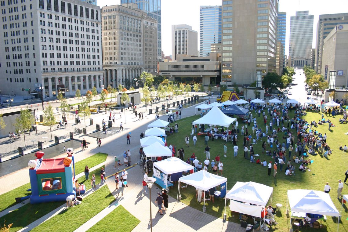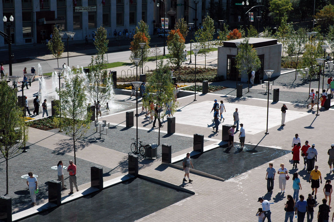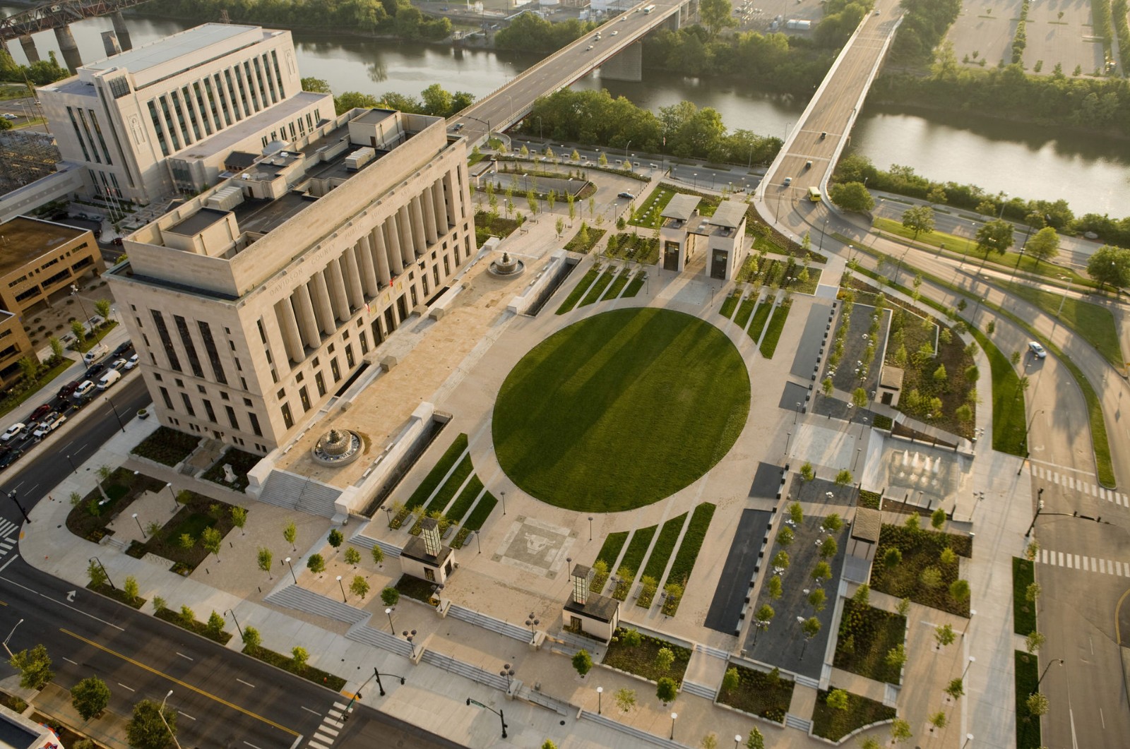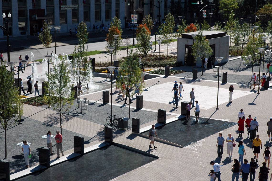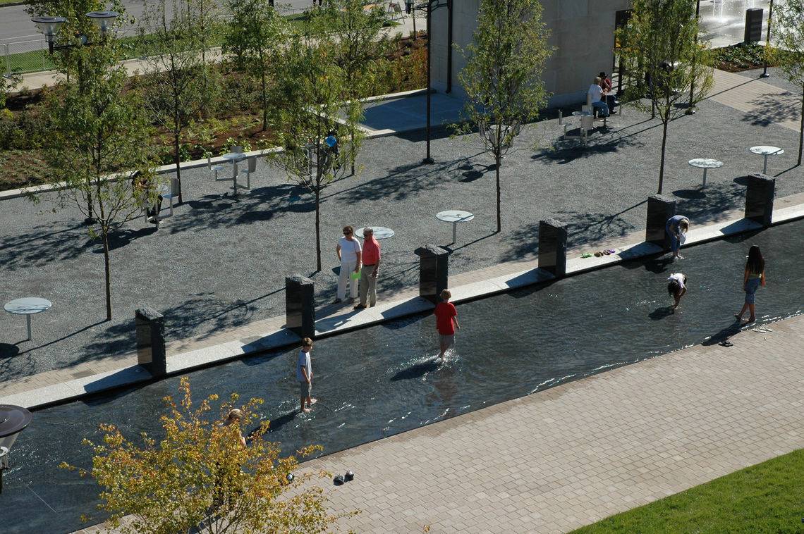 WRT是納什維爾的歷史法院五英畝的市民廣場的首席設計師。在市長的提議下,停車場被移到地下,地上空間成為一個公共聚集空間。廣場地下建構(gòu)起1200停車位的地下停車空間,為法院工作人員和來訪者提供停車服務。在建筑師、景觀設計師、工程師、停車場專家和藝術咨詢師的協(xié)助下,WRT通過設計使廣場能夠最大化容納各類活動,如演唱會、市民活動、集市、工藝品交易和戶外游樂活動等。廣場中部橢圓形的草坪作為柔性空間,承載大型集會。設計師隱藏了地下停車場的出入口,使其不出現(xiàn)在觀景視線中。而參與式噴泉、河流和紀念碑等元素為街區(qū)帶來更多活力,使其更好地融入城市肌理當中。