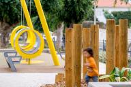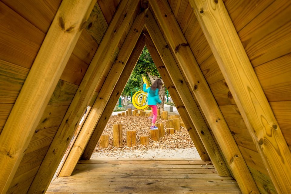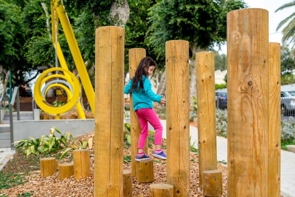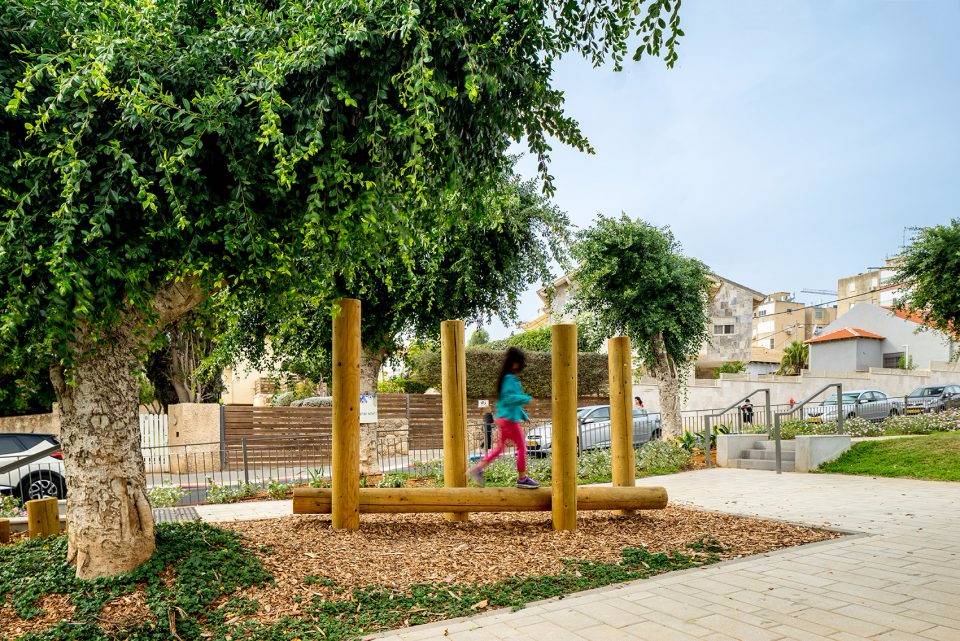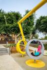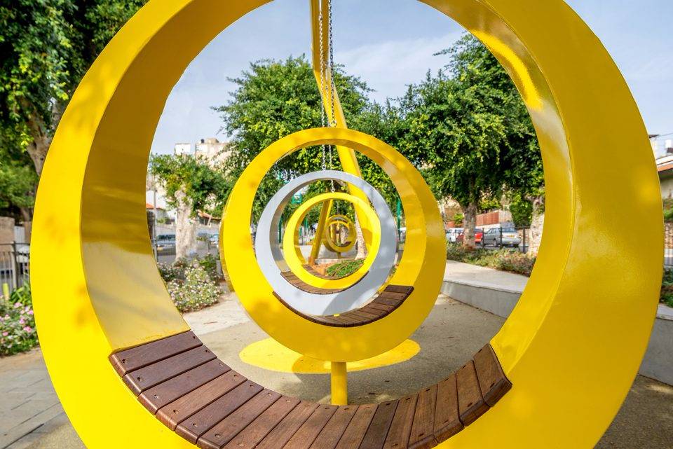 設(shè)計(jì)師在傳統(tǒng)林蔭道的層面上添加了新的“黃色圓圈”,作為休閑雕塑座椅,可供就坐、集會(huì)和玩耍,為林蔭道帶來額外的體驗(yàn)。每組座位均由設(shè)計(jì)團(tuán)隊(duì)和Lemon Collection公司合作完成,包括4個(gè)懸吊在斜梁上的圓形椅子?!包S色圓圈”帶來了不同形式的座位:人們可以在一個(gè)圓圈內(nèi)躺下、爬上圓圈,或者在圓圈中間行走。這些圓圈以不同角度被放置在一個(gè)細(xì)柱上,在夜間會(huì)被燈光照亮。由此,這些黃色圓圈在哈代拉的市中心成為了塑造場(chǎng)所的視覺標(biāo)志。另一項(xiàng)獨(dú)特的置入是貫穿道路始末的游戲木樁。蹺蹺板中常用的木板和木樁被放置在草丘中,帶來有趣的游戲體驗(yàn)。老榕樹形成的天然蔭蔽則帶來了更多駐足停留的方式。