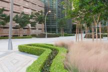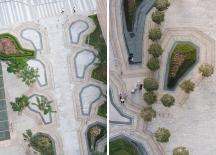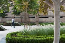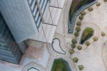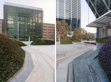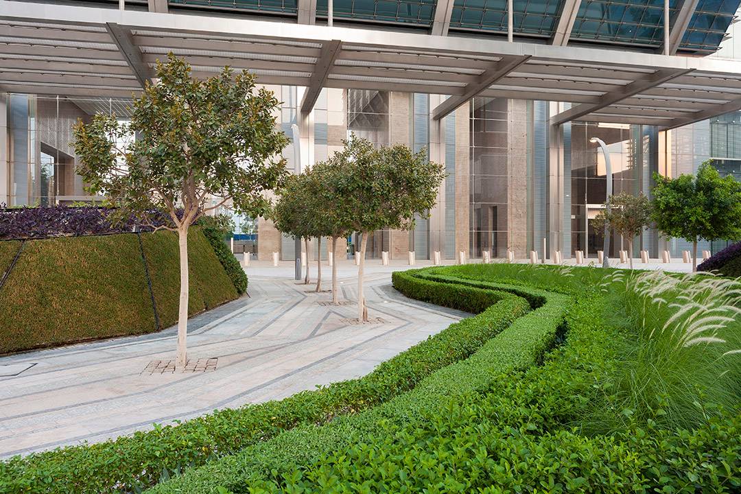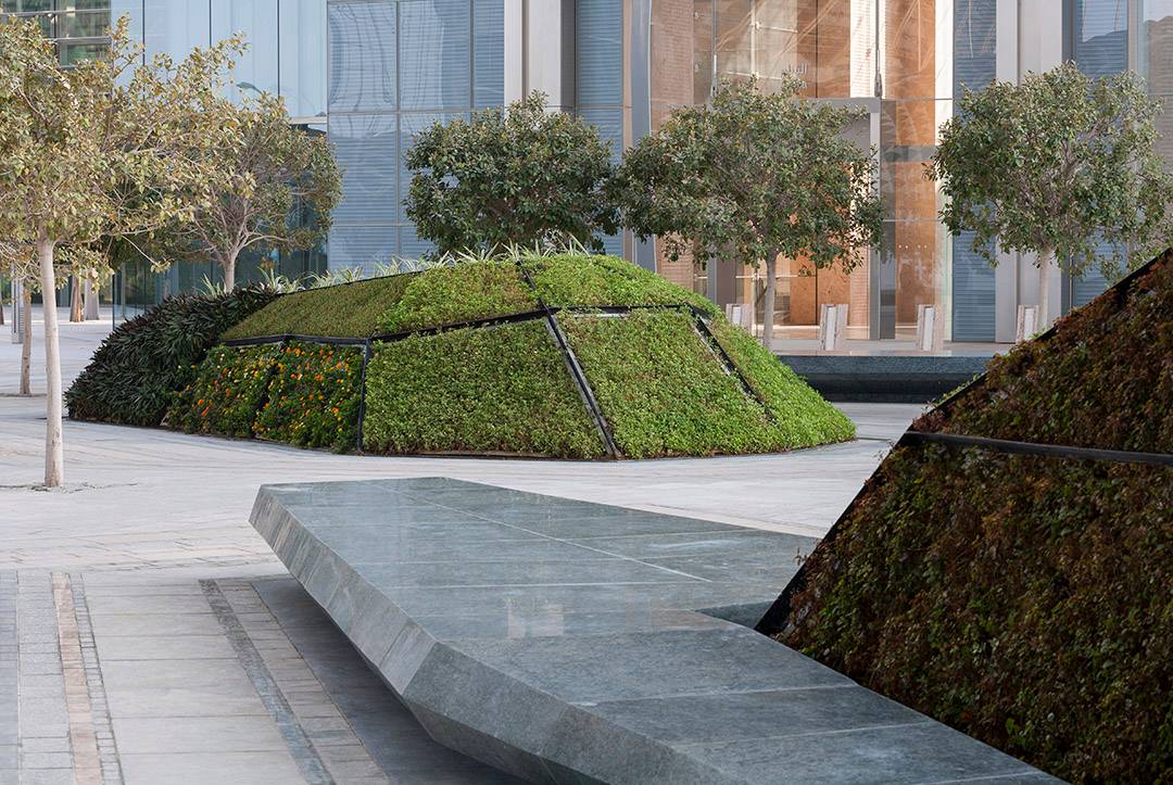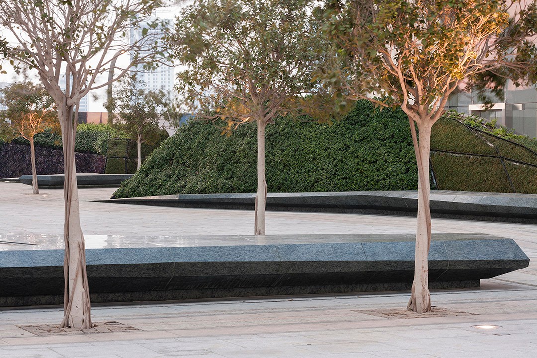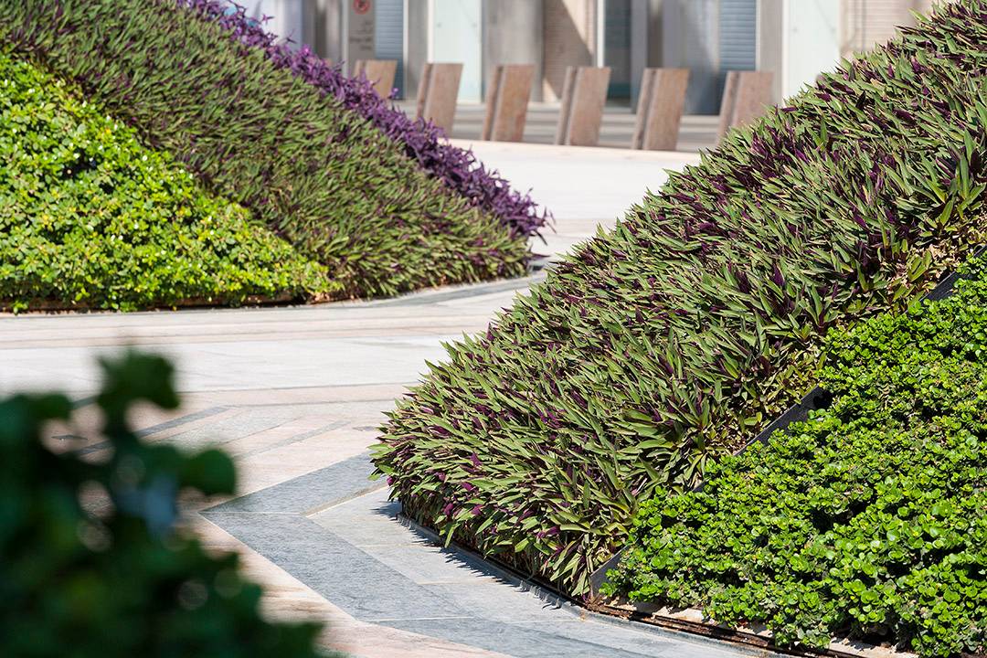 大的綠植堆體構(gòu)成廣場(chǎng)結(jié)構(gòu)。這些堆體看起來像極了室外房間,可以抵擋寒冷的夏馬風(fēng)(來自波斯灣的西北大風(fēng)),因而降低人行步道的風(fēng)力;同時(shí)又在高聳的鋼筋混凝土建筑物中間形成了親密的空間。聚集的堆體形成的裝飾性圖案將整個(gè)廣場(chǎng)編織成了一張大地毯。