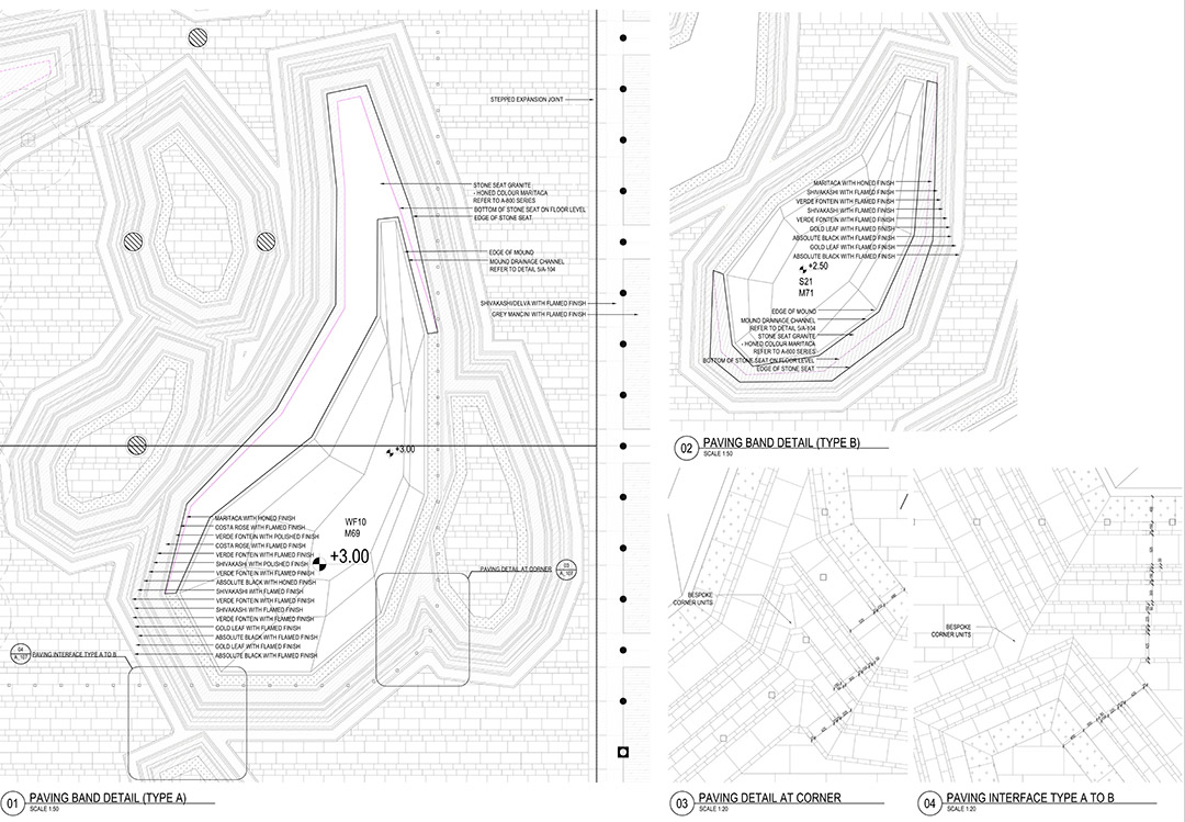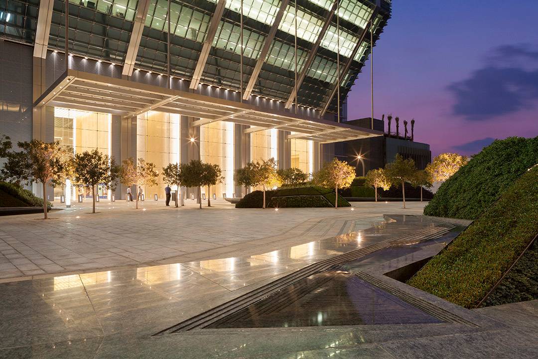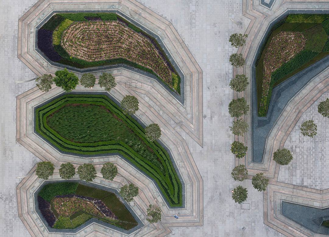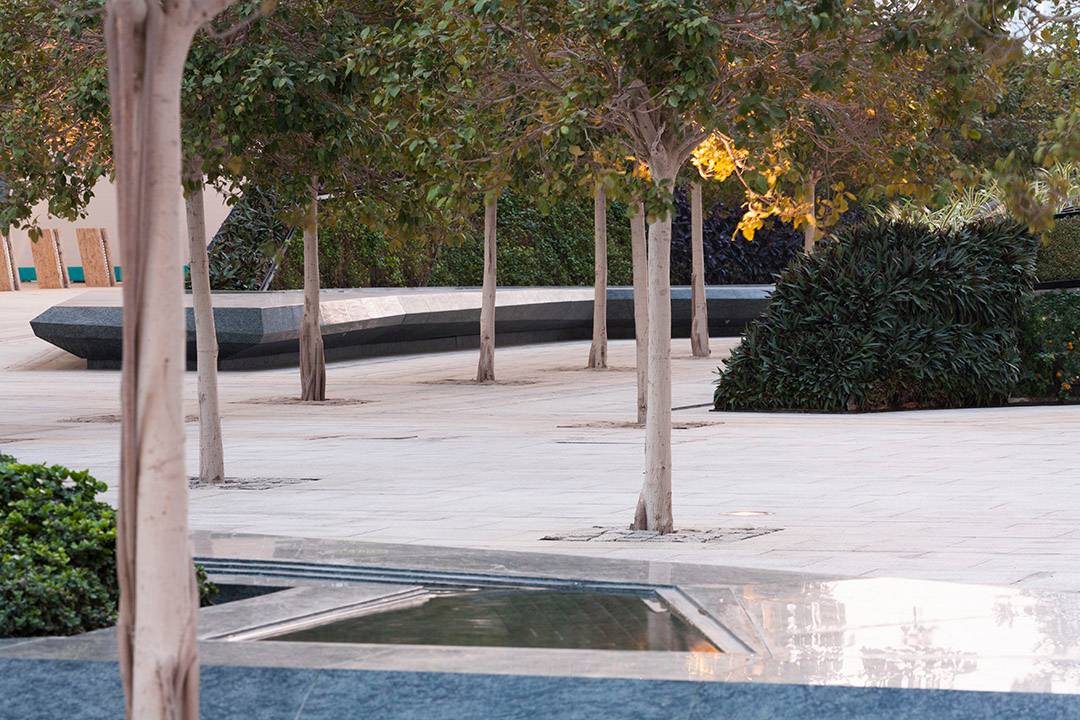設(shè)計(jì)師從大自然和阿拉伯半島固有文化中汲取了設(shè)計(jì)靈感:沙丘、傳統(tǒng)灌溉系統(tǒng)(Falaj)、綠洲、貝多因人的紡織品、阿拉伯聯(lián)合酋長(zhǎng)國(guó)隨處可見的精心修剪的樹籬、以及法國(guó)巴洛克城堡花園。現(xiàn)代的響應(yīng)式設(shè)計(jì)將這些元素融為一體,創(chuàng)造了一個(gè)可持續(xù)的、清涼的和受保護(hù)的微氣候;栽種的綠植和花紋路面形成了如萬花筒般變幻的動(dòng)態(tài)景觀,能夠滿足從周圍的高樓俯瞰廣場(chǎng)的美觀需求。