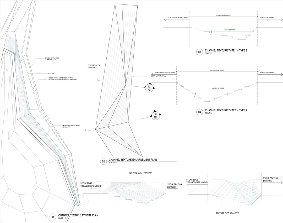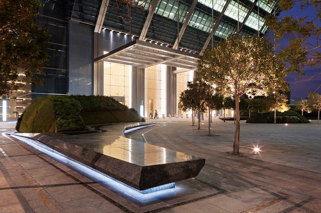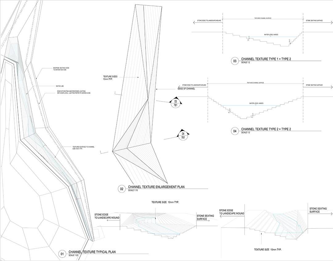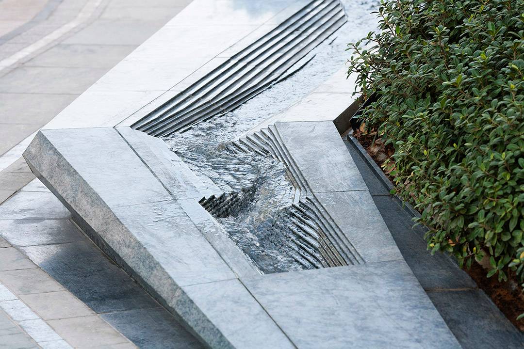 為了制造清涼的感覺,設(shè)計(jì)師在包裹著綠植堆體的長(zhǎng)石凳上運(yùn)用了水元素,休息的人們可以和水來一次親密的接觸,十分有趣!石凳中間是帶有紋理的凹槽,創(chuàng)造了一種動(dòng)態(tài)的水流效果。為了最大程度利用有限的資源、減少蒸發(fā),場(chǎng)地中布置了類似中東地區(qū)常見的古老狹窄灌溉系統(tǒng)水渠的流道。夜晚,底部集成照明裝置投射的燈光讓石凳散發(fā)出無限活力,燈光映出綠植堆體的剪影,將光滑的“地毯”廣場(chǎng)渲染得分外美麗。