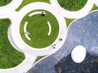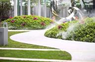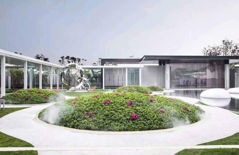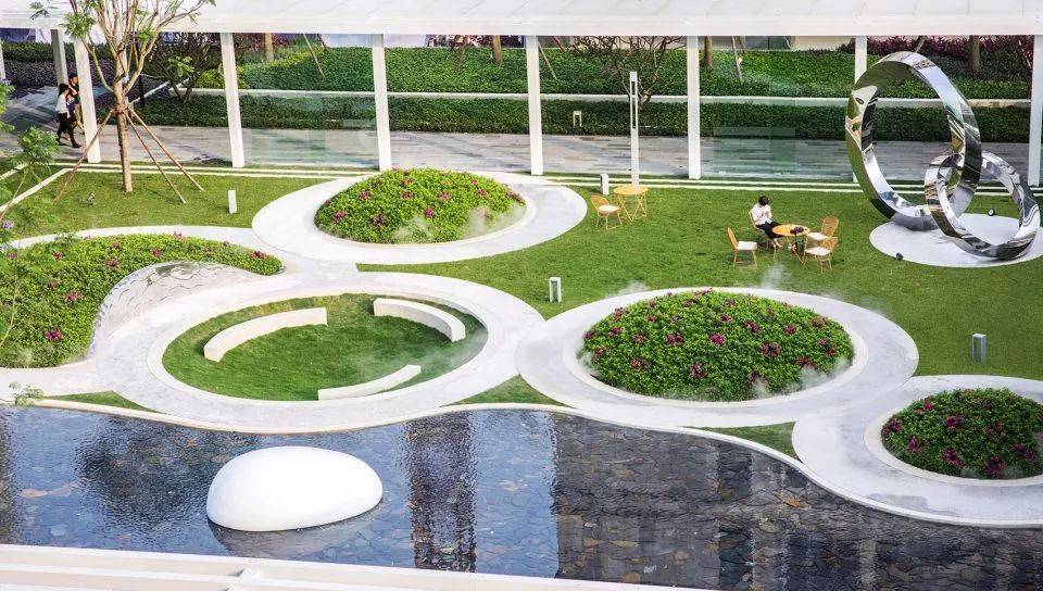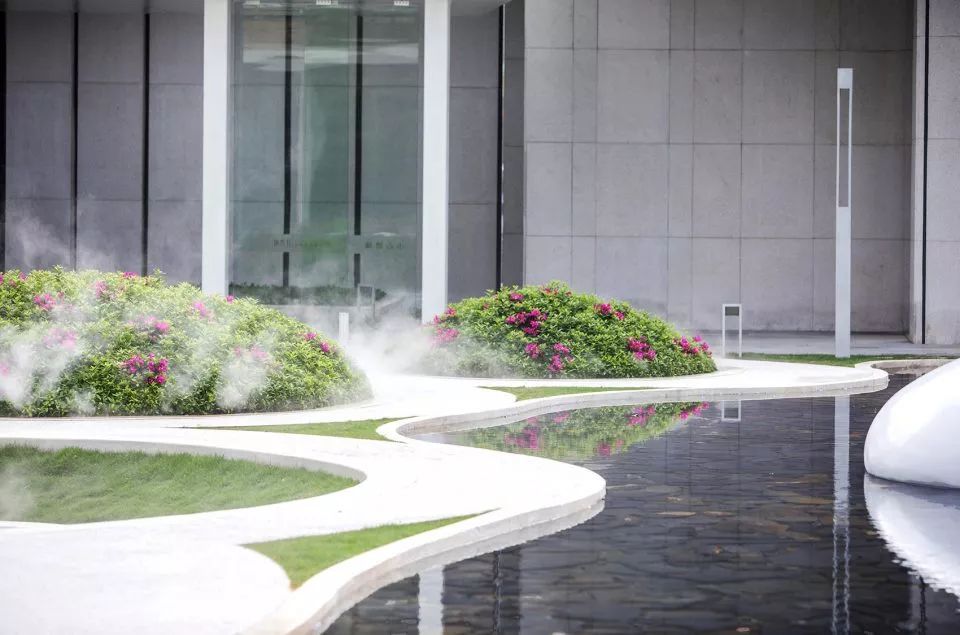 游園空間由四個球形種植(毛杜鵑)和一個下凹綠地組成,塑造出了有趣蜿蜒的散步休憩小徑,設(shè)計想通過相對回旋流轉(zhuǎn)的動線,變相地讓人放慢自己的腳步,或駐足于水岸邊凝望,或沉醉于毛杜鵑叢中的芳香和霧噴仙境中,或遠(yuǎn)望于雙莫比烏斯環(huán)雕塑。