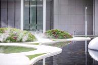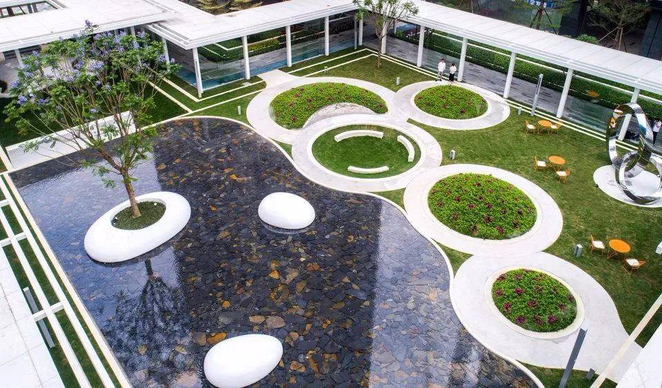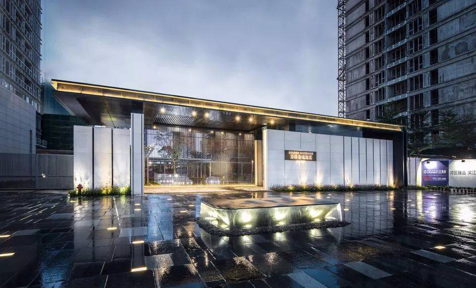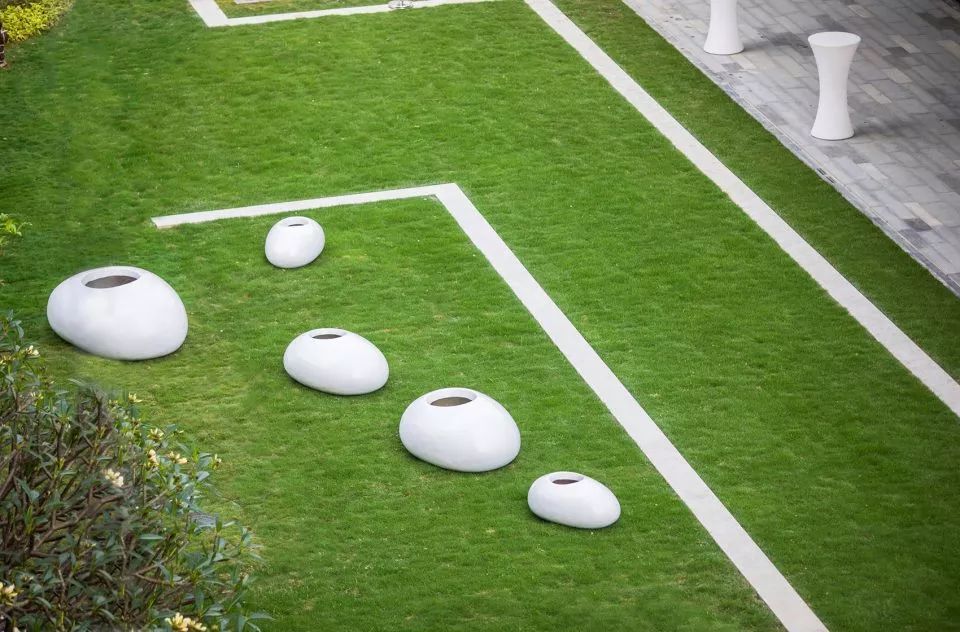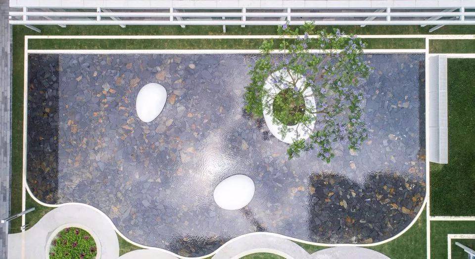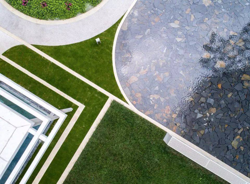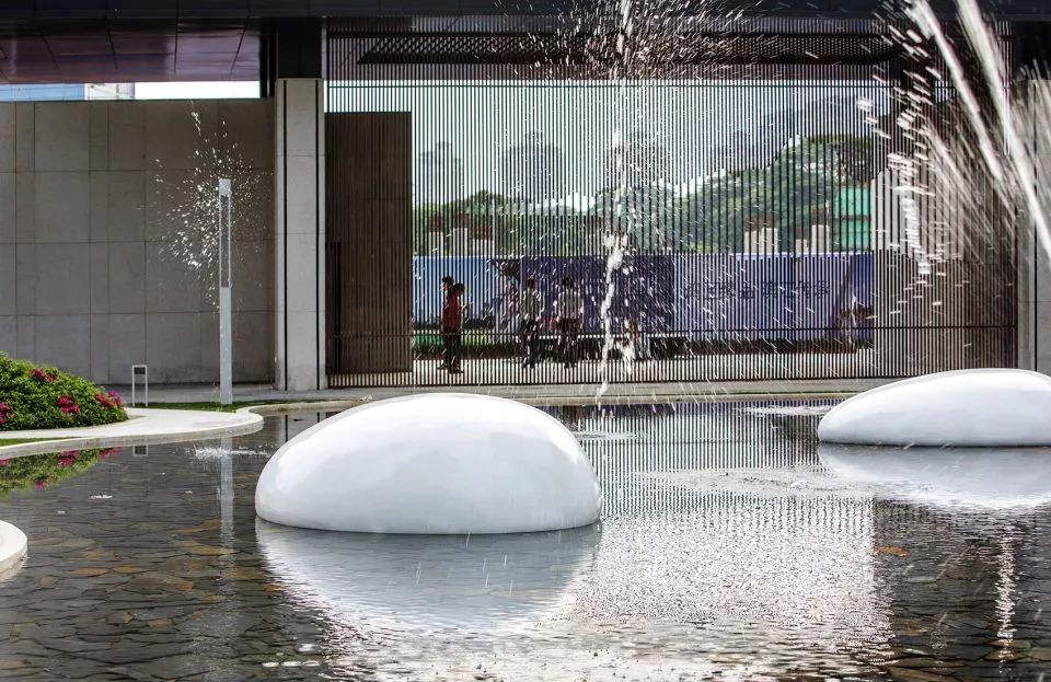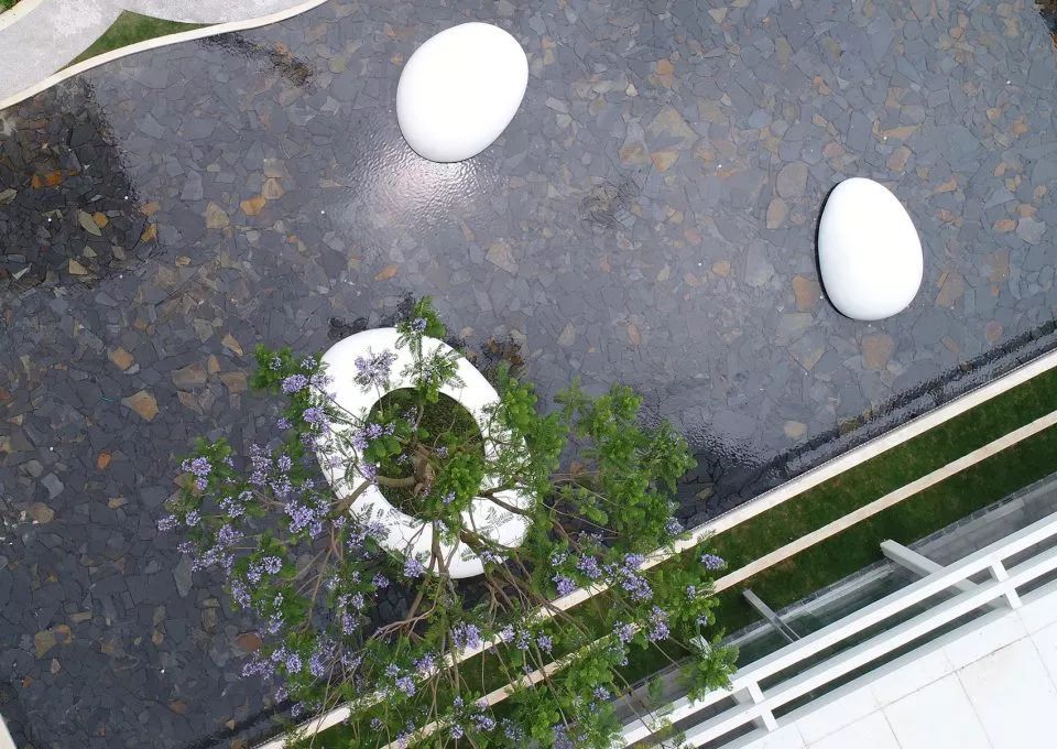 鏡子一般的水面無限延伸豎向維度,獲得更立體的空間,并將歸家的內(nèi)心第一時間沉淀下來,映出瞬間寧靜與安心,三個浮于水面之上的玻璃鋼雕塑小品,也是是品質(zhì)江景生活的濃縮寫照,與此同時,時不時起跳的噴泉, 給人們帶來一絲驚喜感和期待。水景底部的深灰色片巖,讓池底顯得更為沉穩(wěn),讓倒影感以及鏡面效果更突出,同時,片巖天然的色差增加了一絲豐富性。