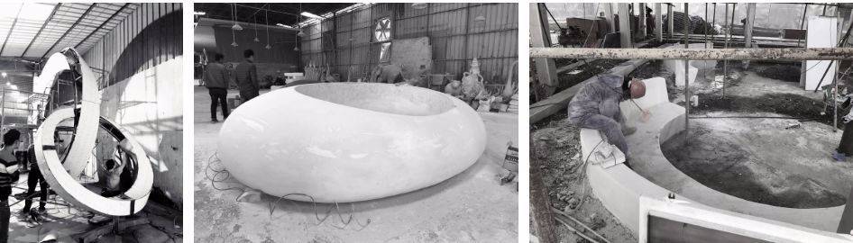 ▼現(xiàn)場施工過程(工人打磨水磨石 – 玻璃鋼小品織模 – 雙莫比烏斯環(huán)板筋)