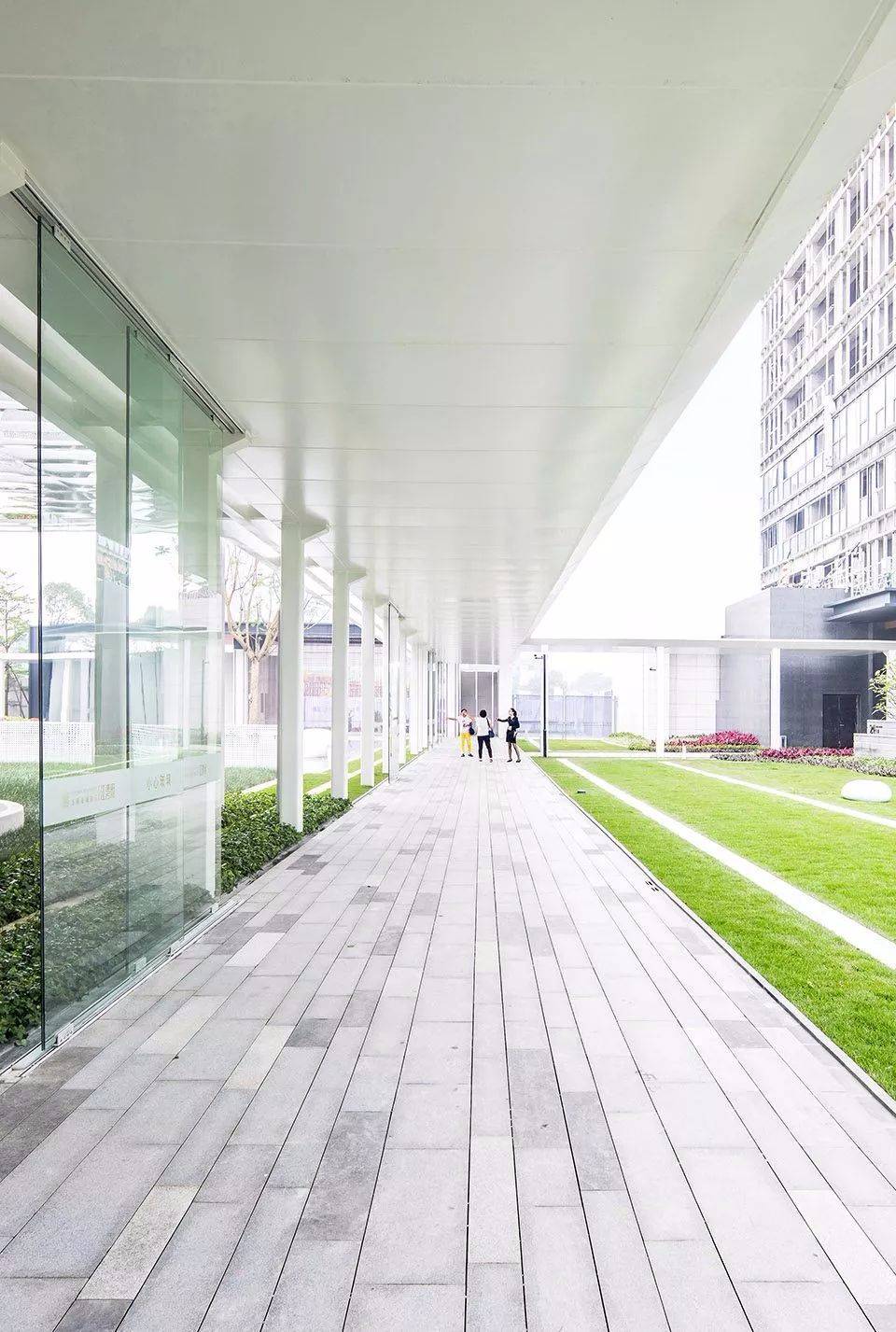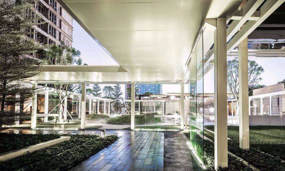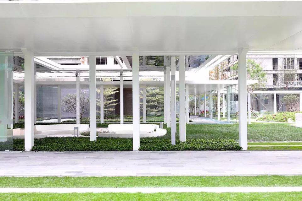 回廊空間將首開區(qū)的三棟樓的入戶空間串聯(lián)了起來,成為人們快速歸家的便捷動線。4m高的白色單臂懸挑廊架增強了通透性和透光性, 減少了壓迫感,同時將架空層空間與庭院空間從視線上連接了起來,又對整個中心庭院起到了框景作用,成為一個360度無死角的景觀環(huán)廊。