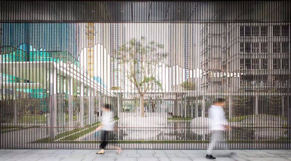 ▼金屬格柵使門后的園景若隱若現(xiàn)