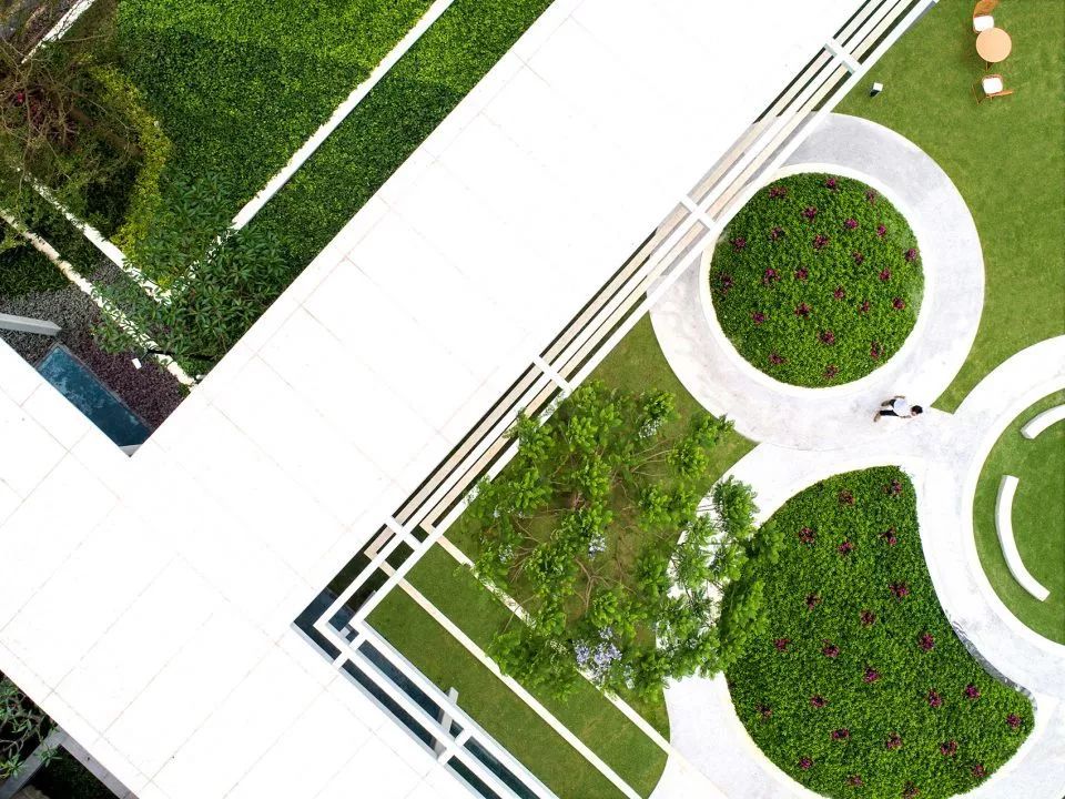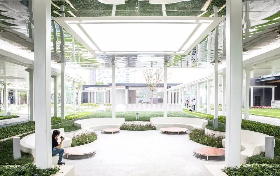 2.簡約統(tǒng)一的材質(zhì)和色調(diào):從即視感出發(fā), 首開區(qū)幾乎只用了兩種色調(diào)的表達- 綠色和白色(綠色是最令人放松的顏色,白色是最干凈的顏色);