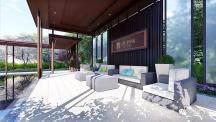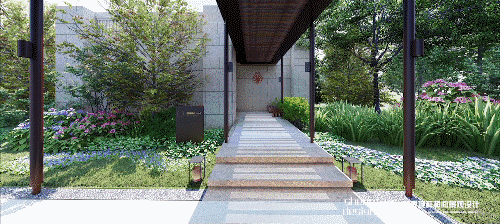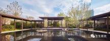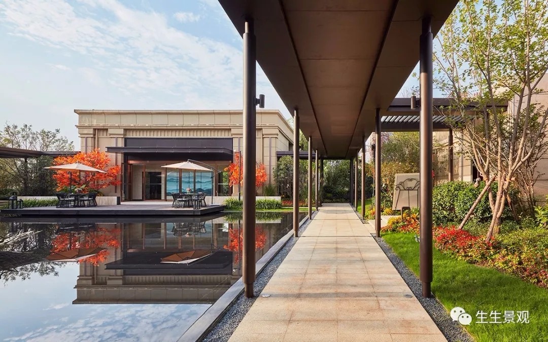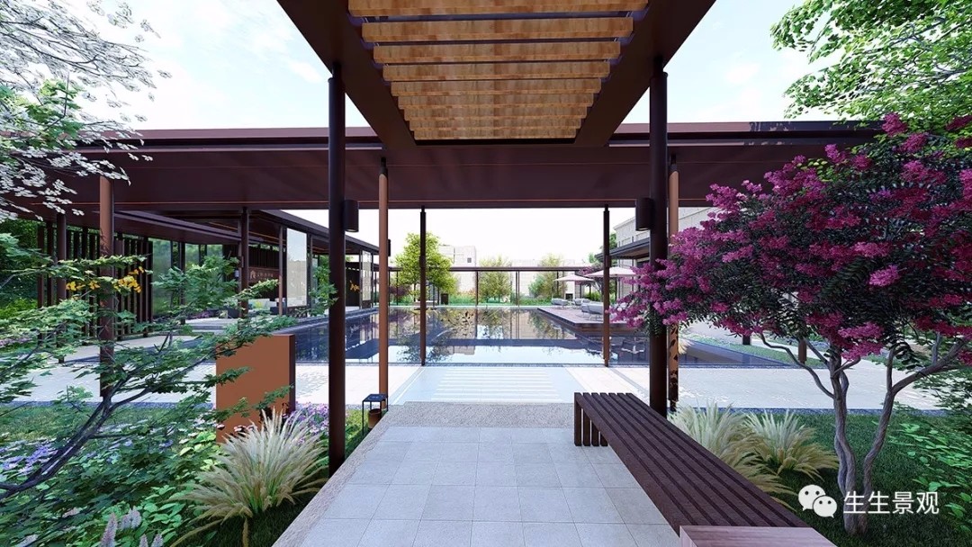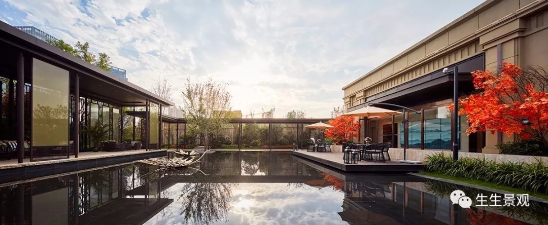 經過景觀門廊,進入水院,木質平臺結合戶外卡座