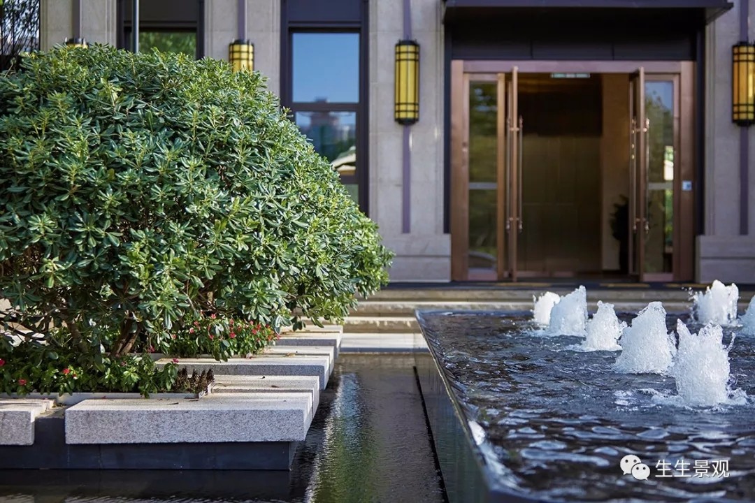 景觀水景懸空挑出,草本花卉精心配置,水幕橫向線條打開,形成開闊大氣的入口。綻放的花朵,轉身迎向黎明,一瓣接著一瓣,等待著陽光。