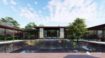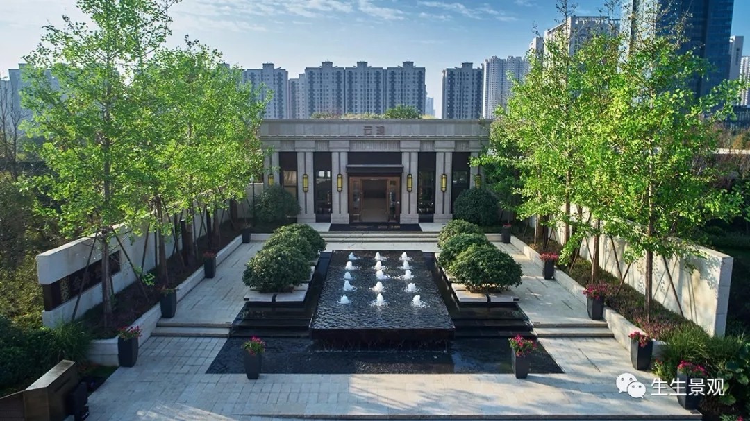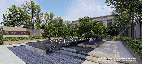 前場空間設計了鏡面水景,通過動態(tài)跌水、踏步的方式,柔和過度場地到外部空間的高差;