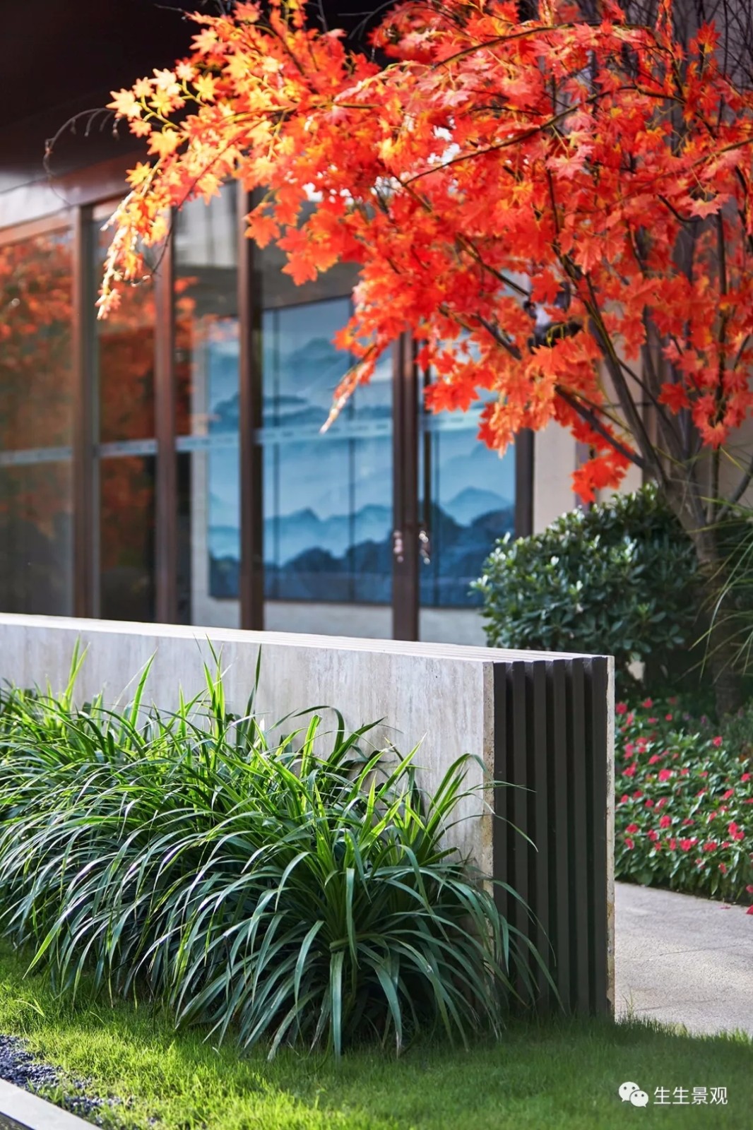 銀杏樹亭亭玉立、端莊惹眼,與金色的陽光交相輝映,熠熠發(fā)光。而嵌入水景的山杏此刻成了極好的天然襯景,墨綠的底色映襯得金色越發(fā)鮮亮。