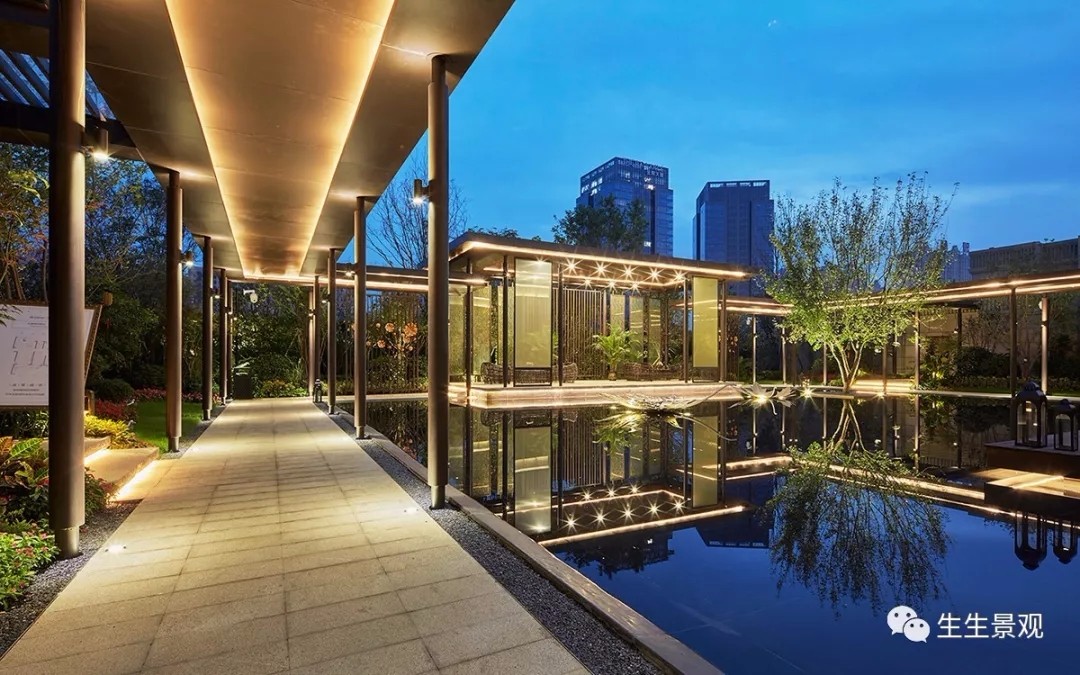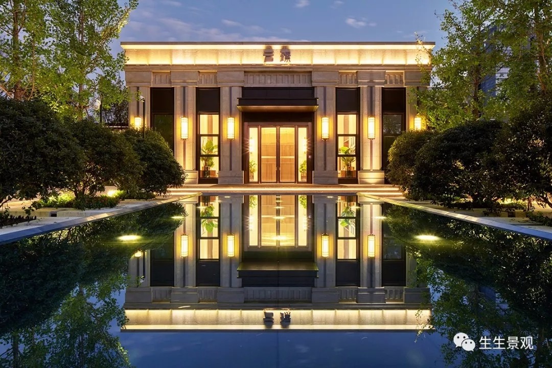 走過銀杏步道,前廳映入眼簾。與意式建筑相呼應,以現代的設計手法,將天際線融入景觀,線性引導的鋪裝、跳躍的涌泉、漫射的燈光與景觀多維度互動,形成無縫連接,構建質感豐富、靈動通透的空間。