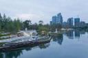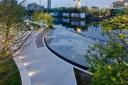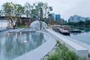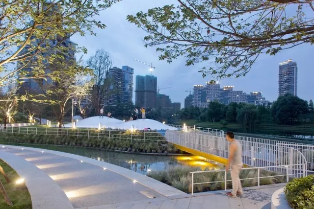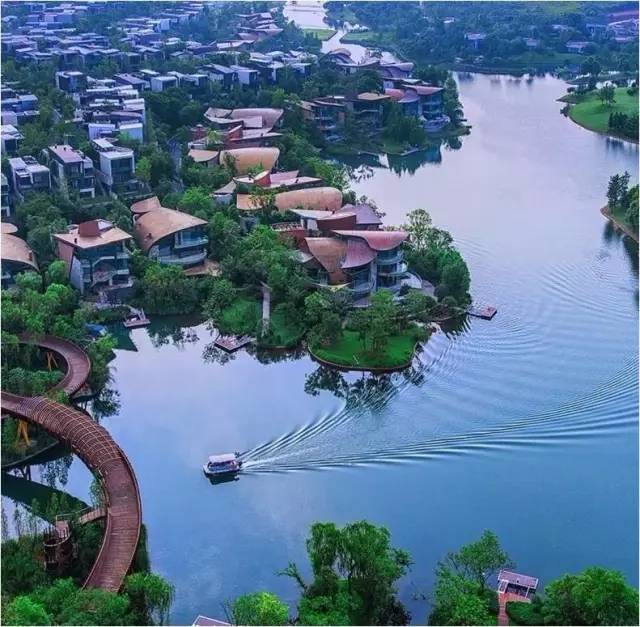 成都麓湖不是一個天然湖,而是一個巨大的人造的雨水生態(tài)系統(tǒng),我們介入的時候湖面已經(jīng)完成,效果非常好。湖上可以進行各種水上活動,明星建筑師們設(shè)計的建筑和橋獨特而有魅力。