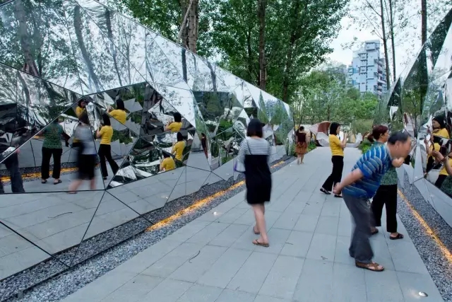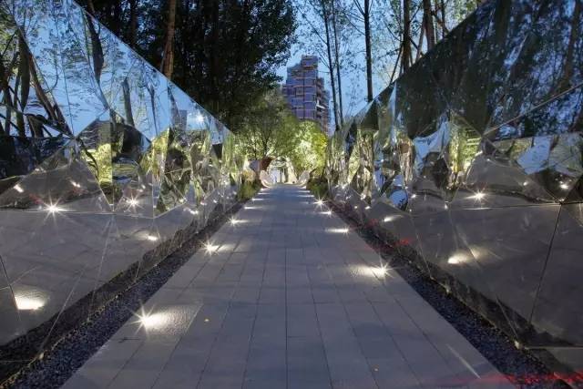 冰川峽谷:在原有擋土墻和樹木基礎(chǔ)上調(diào)整。受冰川峽谷啟發(fā),三角面組成的鏡面墻反射天光,暗藏的聲音感應(yīng)裝置,當(dāng)人穿過時會聽到水滴在峽谷中的回響。