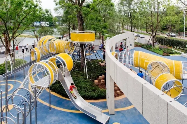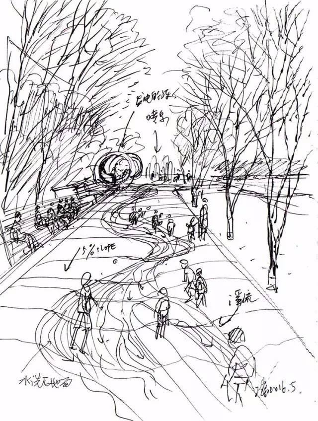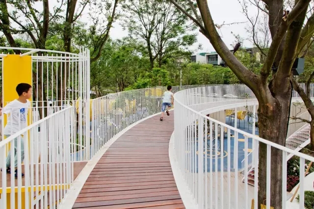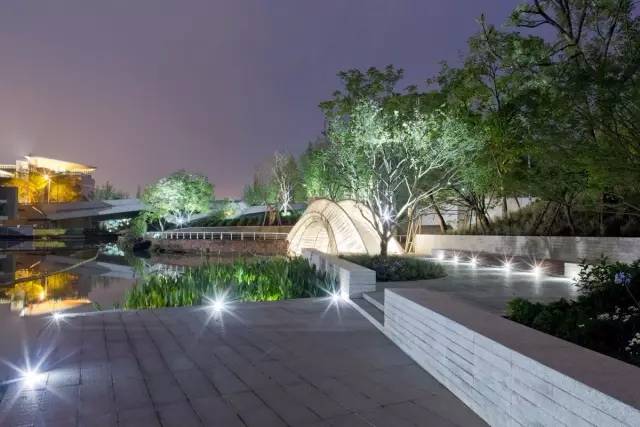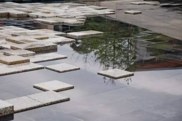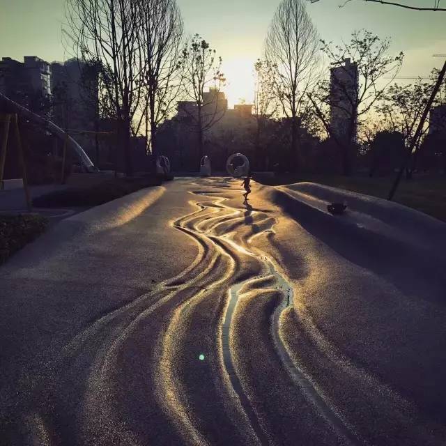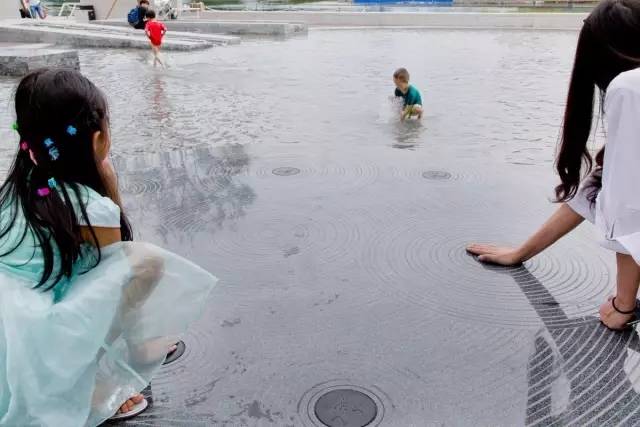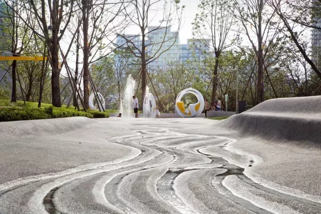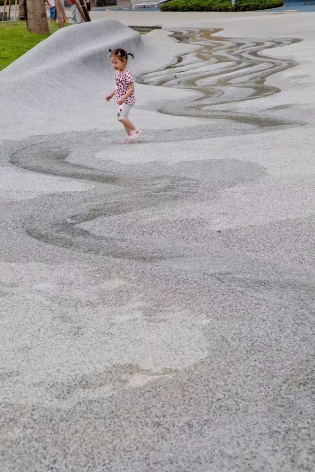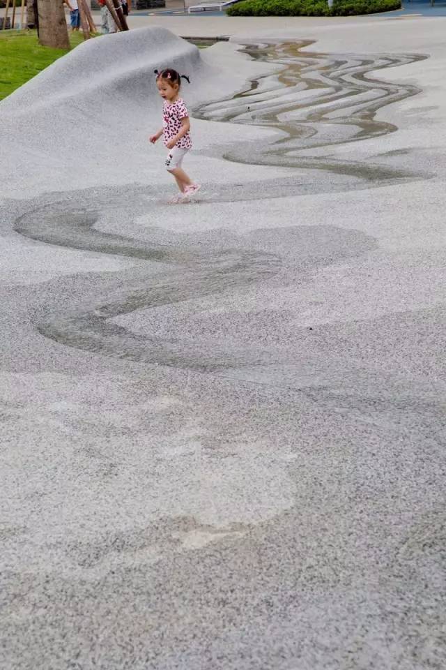 曲溪流歡:這是結(jié)合消防通道的一個改造。旱噴廣場噴出的水匯聚在廣場中央順地形流下來,自然形成一條蜿蜒曲折,可以充分參與的小溪。