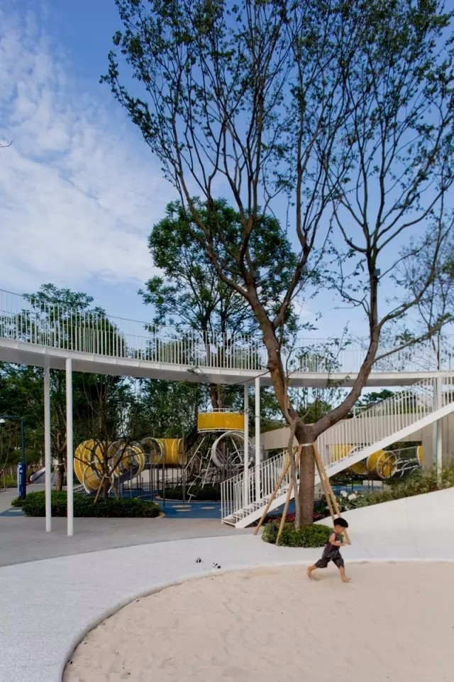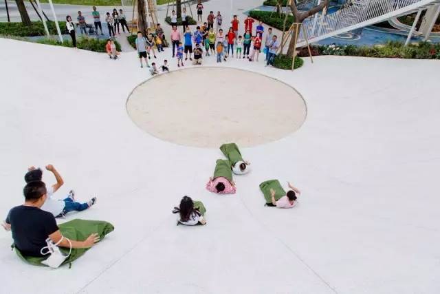 冰雪滑梯:利用現(xiàn)場山坡地形設(shè)置了一組游戲設(shè)施,包括空中環(huán)形走廊,旋轉(zhuǎn)樓梯,沙坑和白色水磨石滑坡。