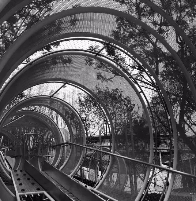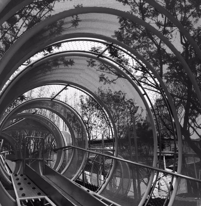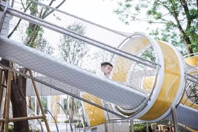 漩渦爬網(wǎng):專門設(shè)計和制作的一組組合活動器械,包括爬網(wǎng)、滾軸滑梯、激光陣、樹屋等各種活動內(nèi)容。在內(nèi)部有旋渦的視覺感受,器械整體形式上取義于麓湖吉祥物鹿之角。