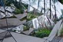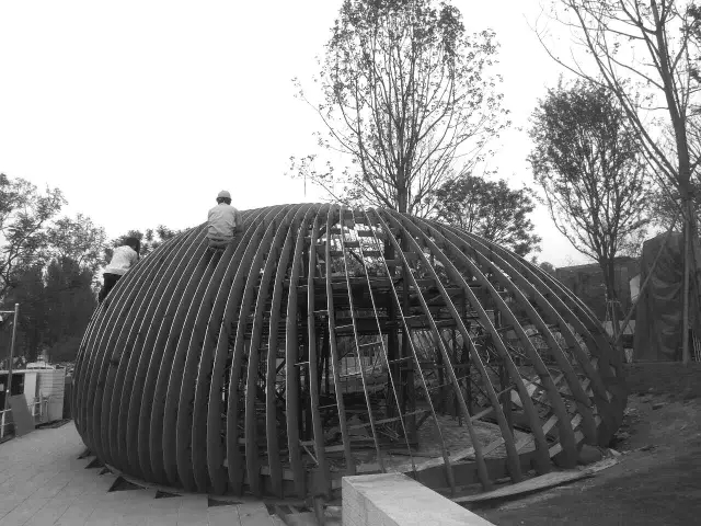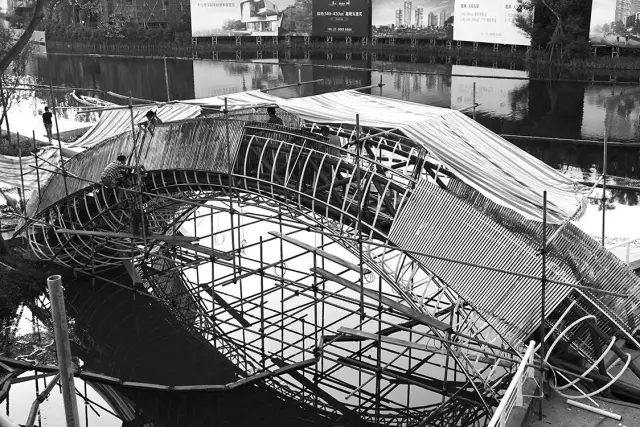 勤勞的工人在安裝冰凌拱橋的外飾格柵