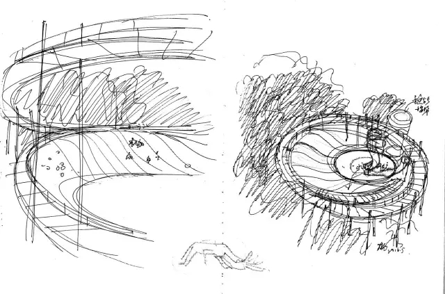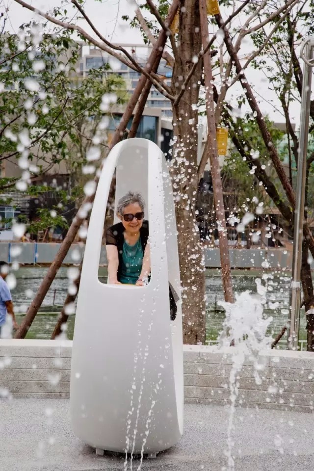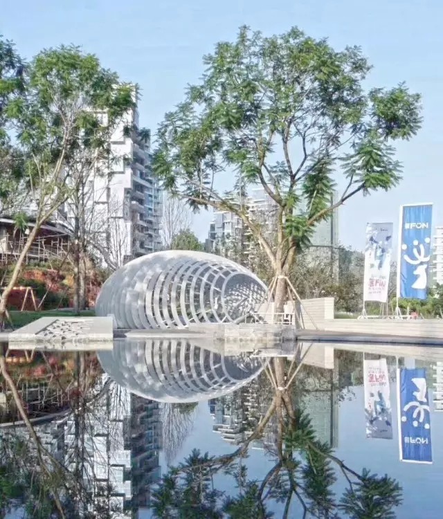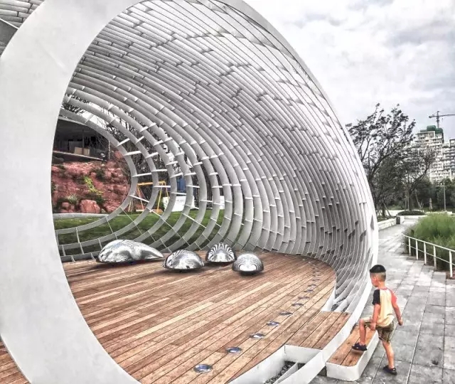 水滴劇場:臨湖有一個具有雕塑感的構(gòu)筑,造型來源于一滴水。由不銹鋼異形加工而成,內(nèi)部水滴狀坐凳為鏡面不銹鋼,可以轉(zhuǎn)動。