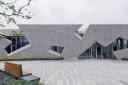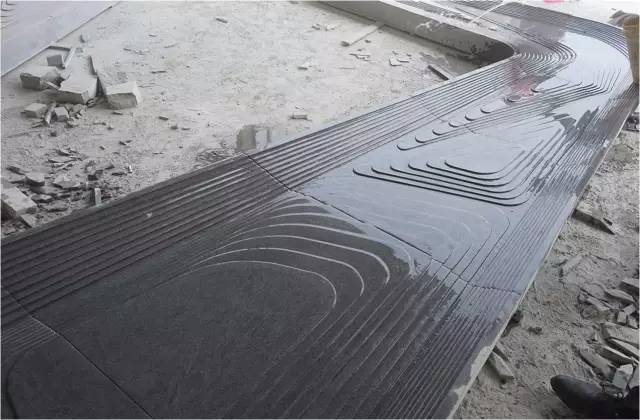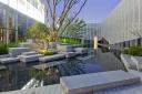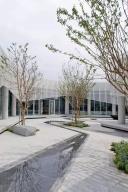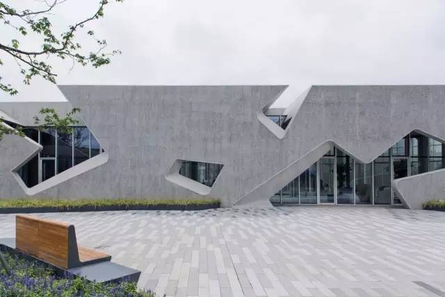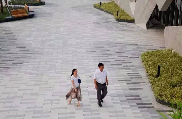與市政道路相鄰的沿街區(qū)域是重要的景觀界面,作為給人們第一印象的空間,須與建筑成為一個(gè)融合的整體。因此我們把設(shè)計(jì)范圍拓展至原有的市政人行道以維持空間的整體感;地面鋪裝用芝麻白、兩種灰度的芝麻灰和福鼎黑四類石材穿插鋪設(shè),整體形態(tài)抽象自“太湖石”的孔洞形式,與建筑的語言保持一致性。同時(shí)同色系混拼鋪裝的躍動(dòng)感,也能襯托出建筑立面的細(xì)膩純凈。